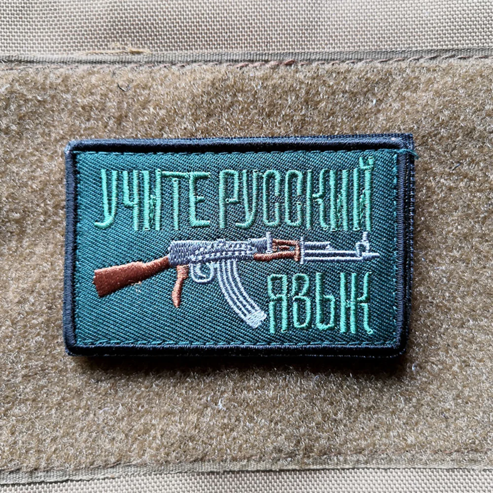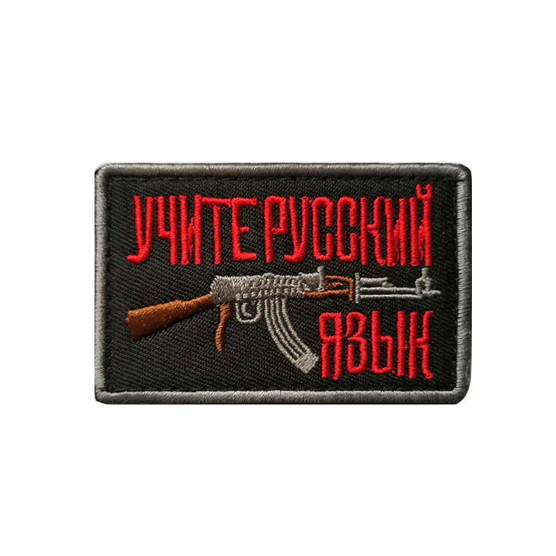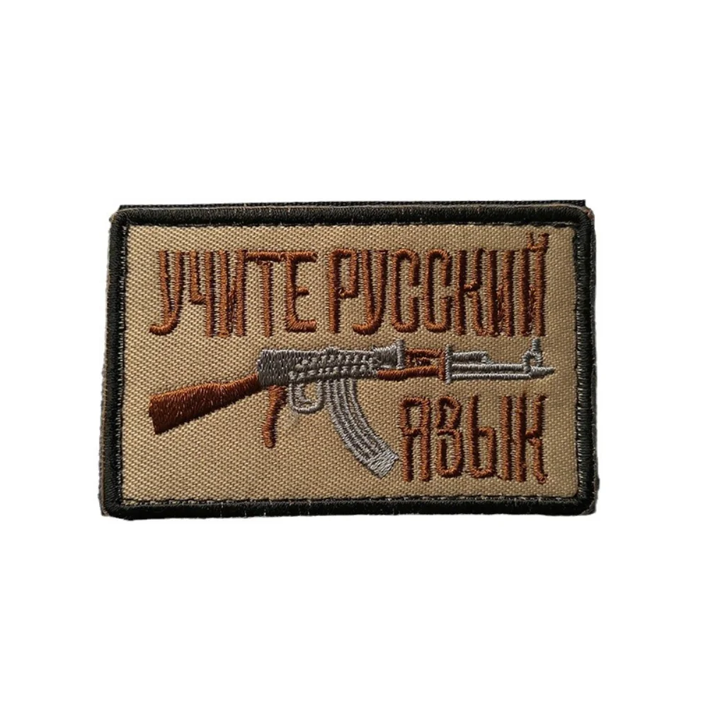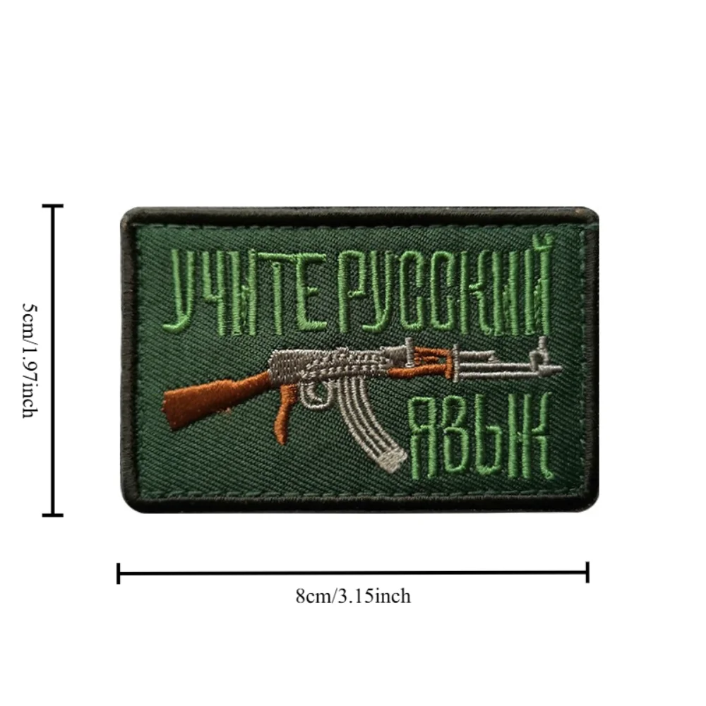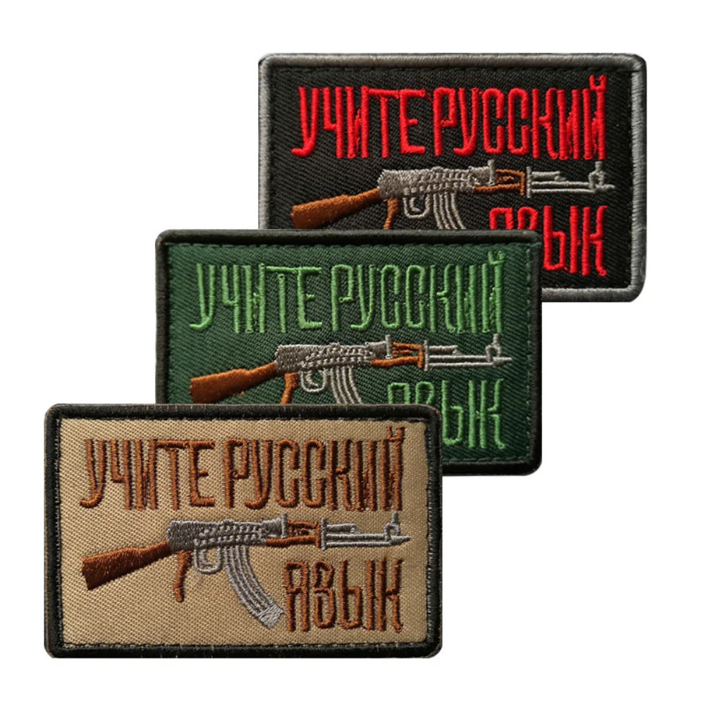 This set of three embroidered patches is crafted from durable polyester, showcasing detailed illustrations of an AK-style rifle. Each patch features unique color schemes: a black background with bright red Cyrillic text stating “УЧИТЕ РУССКИЙ ЯЗЫК,” a dark green background with green text, and a tan background with brown text. Sized as depicted in the image with a permissible deviation of 1-3mm, these patches are designed for unisex use on jackets, backpacks, hats, military vests, and helmets. The hook and loop backing allows for easy attachment, while the 3D effect and eco-friendly materials ensure both quality and style. Available in Antique Copper, Antique Brass, and Antique Silver.