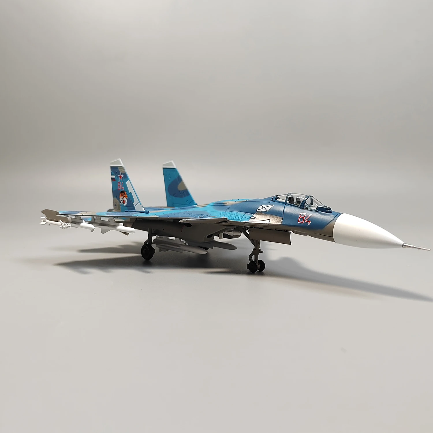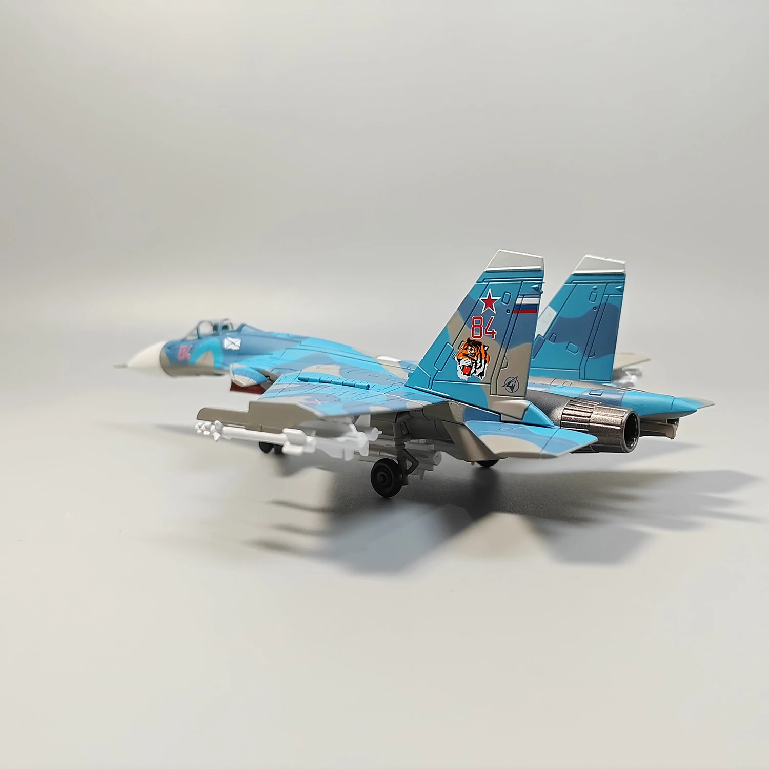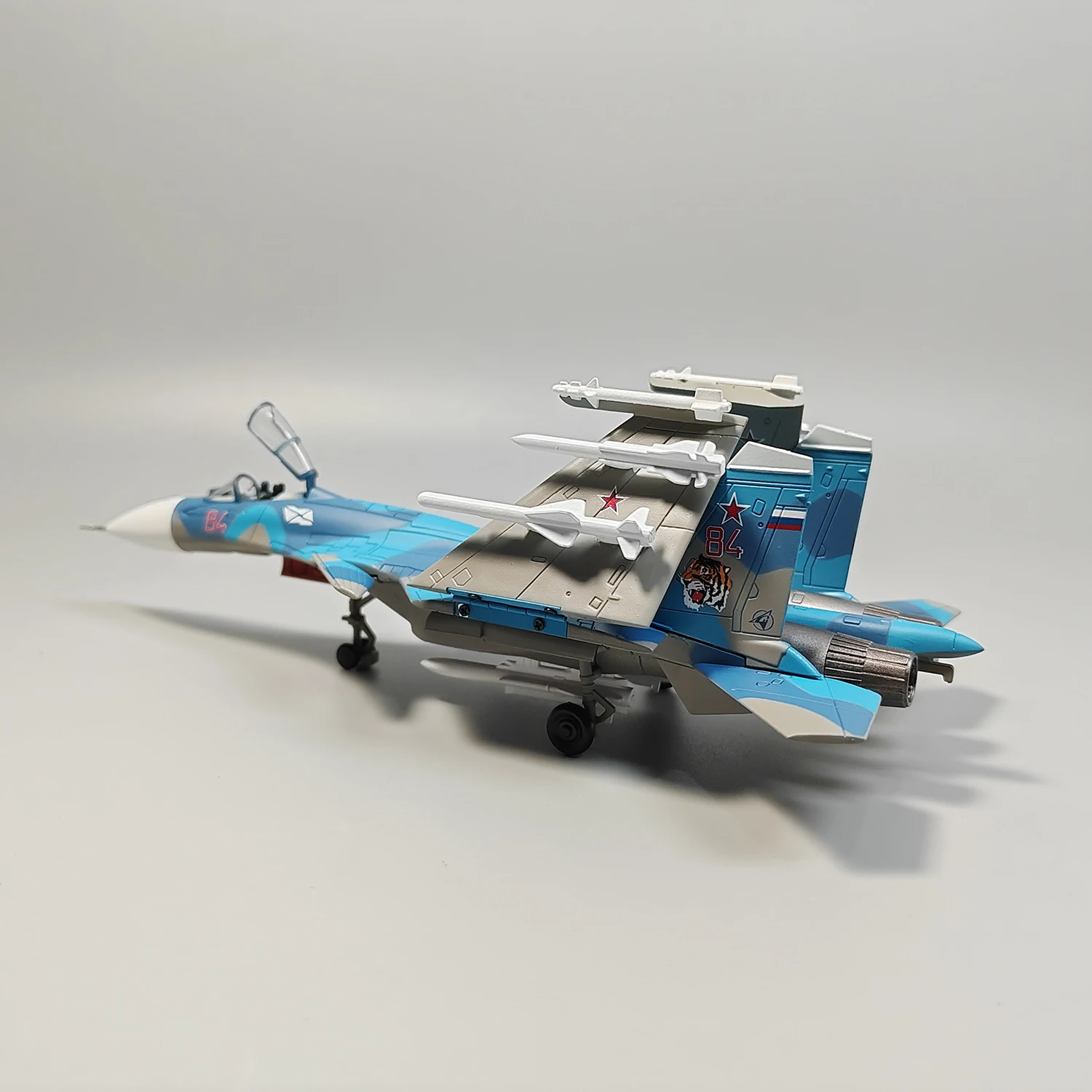 Step into the world of military aviation with this meticulously crafted 1:100 scale diecast model of the Russian Navy Su-33 carrier-based fighter aircraft. Designed as a premium display piece, this model showcases striking blue camouflage with beige and light gray accents, capturing the modern military aesthetic. The white nose cone provides a sharp contrast, while the detailed panel lines and textured surface emphasize realism. The transparent cockpit reveals intricate interior detailing, and the swept-back wings, twin stabilizers, and mounted missiles highlight aerodynamic design. Small landing gear with black wheels adds authenticity. Made from durable alloy and ABS plastic, this model promises to be a stunning addition to any collection, evoking pride and admiration for aerospace craftsmanship.