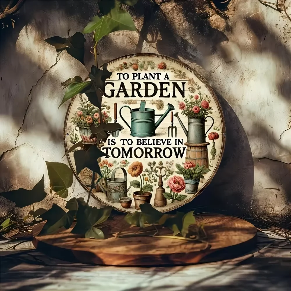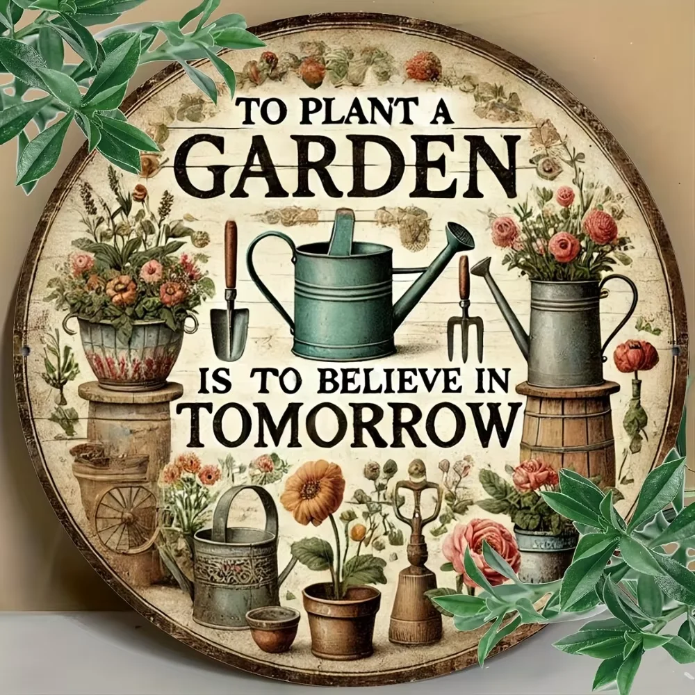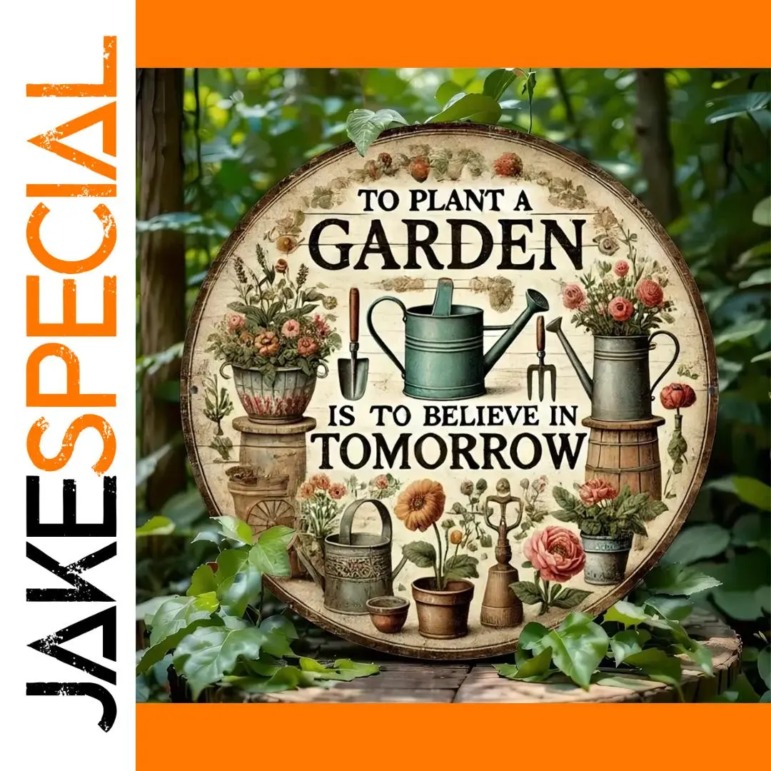 Transform your home or garden with this beautiful vintage-inspired wall plaque. Crafted from durable aluminum, it features a 20x20cm size with a warm, natural wood finish and colorful watercolor-like floral illustrations. The distressed, aged surface adds a nostalgic touch, making it perfect for creating a cozy, vintage atmosphere. The bold black “TO PLANT A GARDEN” and “GARDEN” texts, along with the uplifting “IS TO BELIEVE IN TOMORROW” message, evoke a sense of optimism and love for gardening. Its versatile design allows you to hang it indoors or outdoors, from garden walls to patios, or even display it on a table. Bring a charming and heartfelt decorative piece into your life today.
