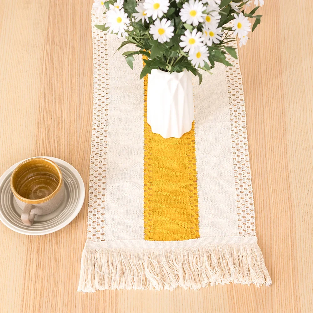 Imagine adding a warm, inviting touch to your dining space with this beautifully crafted, hand-woven table runner. Designed to evoke a cozy farmhouse atmosphere, it features a natural beige color with a distinctive striped pattern created from a blend of linen, jute, polyester, and cotton. The woven texture and embroidered details highlight artisanal craftsmanship, perfectly complementing country-themed weddings, birthday parties, or everyday home decor. Its rustic charm is further enhanced by soft fringed tassels along the edges, adding a gentle, handmade finish. Available in multiple sizes, this versatile table runner is ideal for creating an intimate and welcoming dining experience, turning any occasion into a special event.