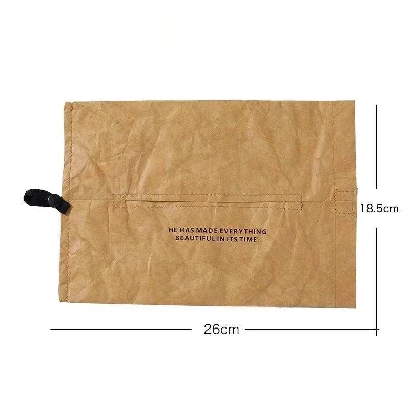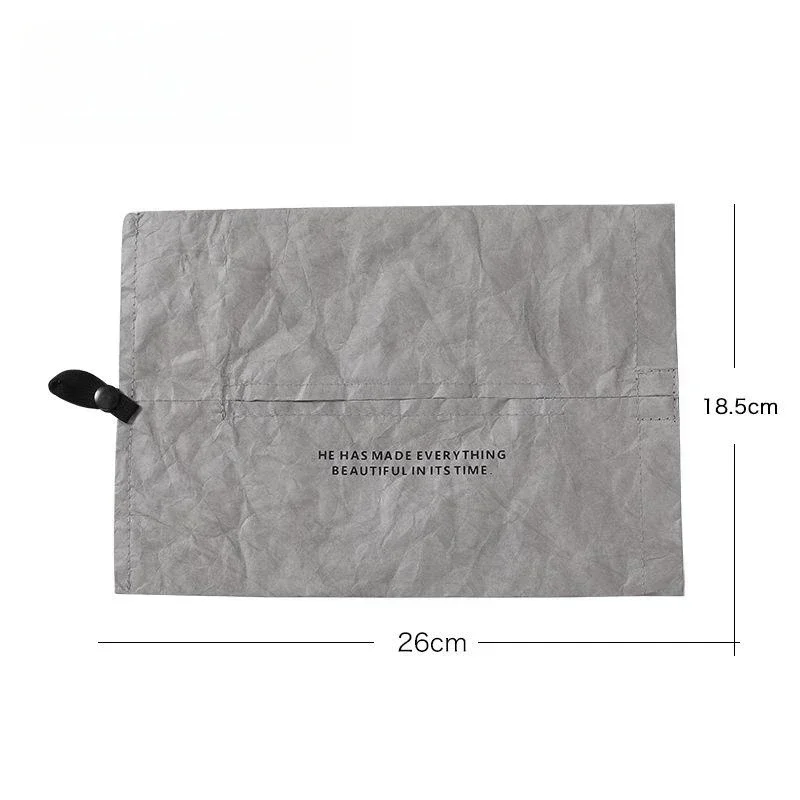 Imagine elevating your space with these beautifully crafted tissue sachets, each made from lightweight DuPont paper and designed to blend practicality with a touch of rustic charm. Available in warm yellow-beige, classic black, muted green, and comforting grey, these pouches showcase a casual, handcrafted look. The minimalist design features simple horizontal openings revealing white tissues, with inspiring black text, “HE HAS MADE EVERYTHING BEAUTIFUL IN ITS TIME.” Whether for travel, home, or gifting, these pouches are perfect for adding an understated decorative touch. Their textured, crinkled material and functional black cords with toggles combine to create an organic, relaxed vibe that makes tissue access easy while enhancing your decor aesthetic.