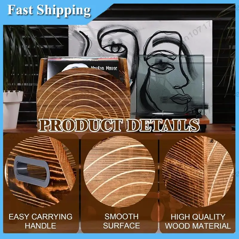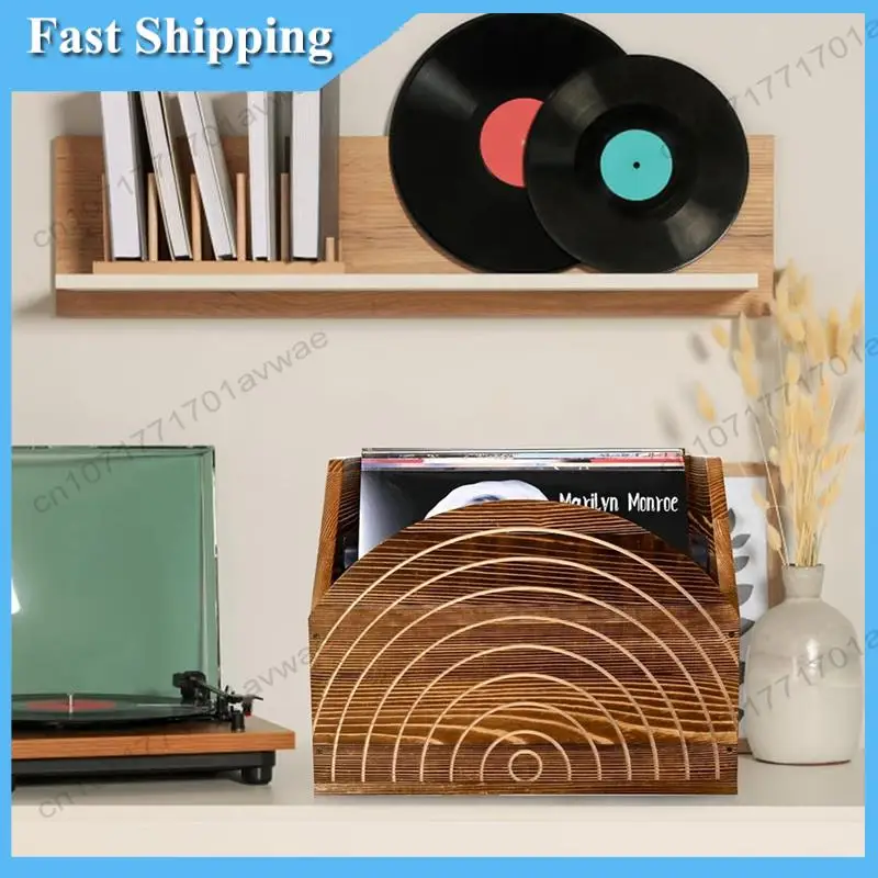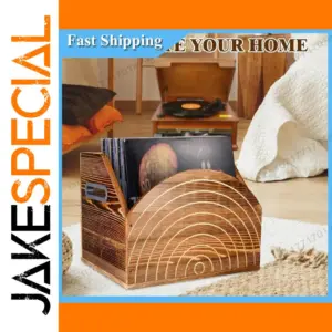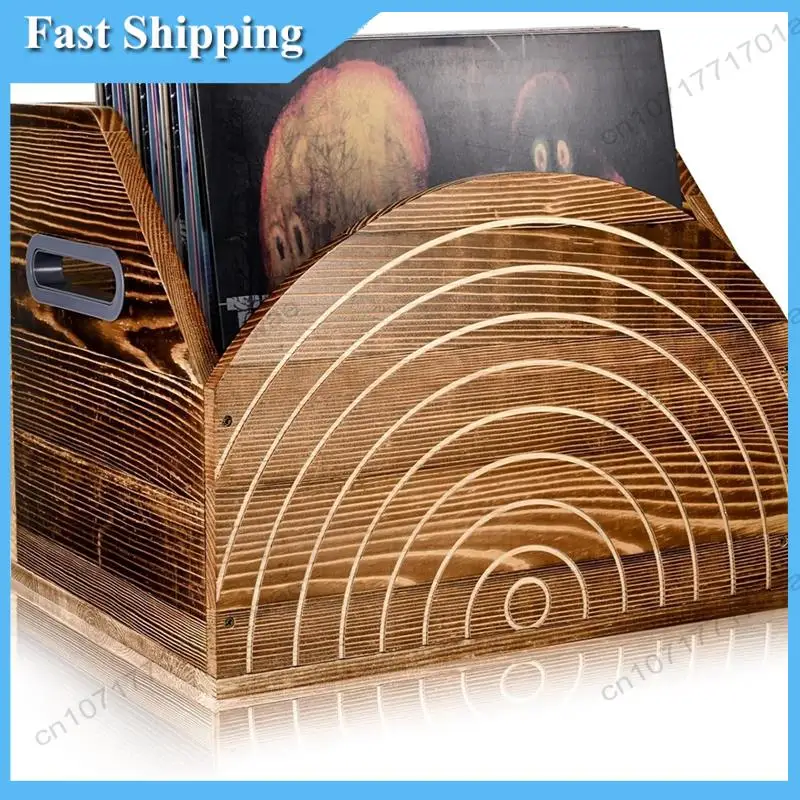 Imagine elevating your music collection with this beautifully crafted wooden record holder. Its natural wood finish and rustic design add warmth to any space, whether in your living room, office, or music corner. The semi-circular front with etched sound wave patterns creates a subtle decorative touch while keeping your albums organized and easily accessible. Crafted to support over 60 albums, this sturdy holder supports up to 45+ lbs with reinforced joints for lasting durability. Its portable side handles make it effortless to move between rooms, and the neutral wood color seamlessly matches various styles. Enjoy a relaxed vibe by showcasing your beloved records in style and functionality, enhancing your personal space or shop display with this elegant piece.