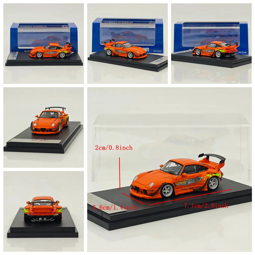 Experience the thrill of owning this meticulously crafted 1:64 scale RWB 993 RAUH-Welt Porsche diecast model, designed for passionate collectors and enthusiasts. With its vibrant orange exterior and dynamic black and gray stripe decals, this miniature captures the sporty, aggressive spirit of the original race car. The aerodynamic body features rounded headlights, a sleek low-profile stance, and extendable front bumper edges for added realism. The large black rear wing spoiler enhances its bold aesthetic, complemented by silver multi-spoke rims mounted on black tires. Thanks to detailed interiors visible through clear windows, you can admire the racing seats and dashboard. Perfect for display, gifting, or adding a dynamic touch to your collection.