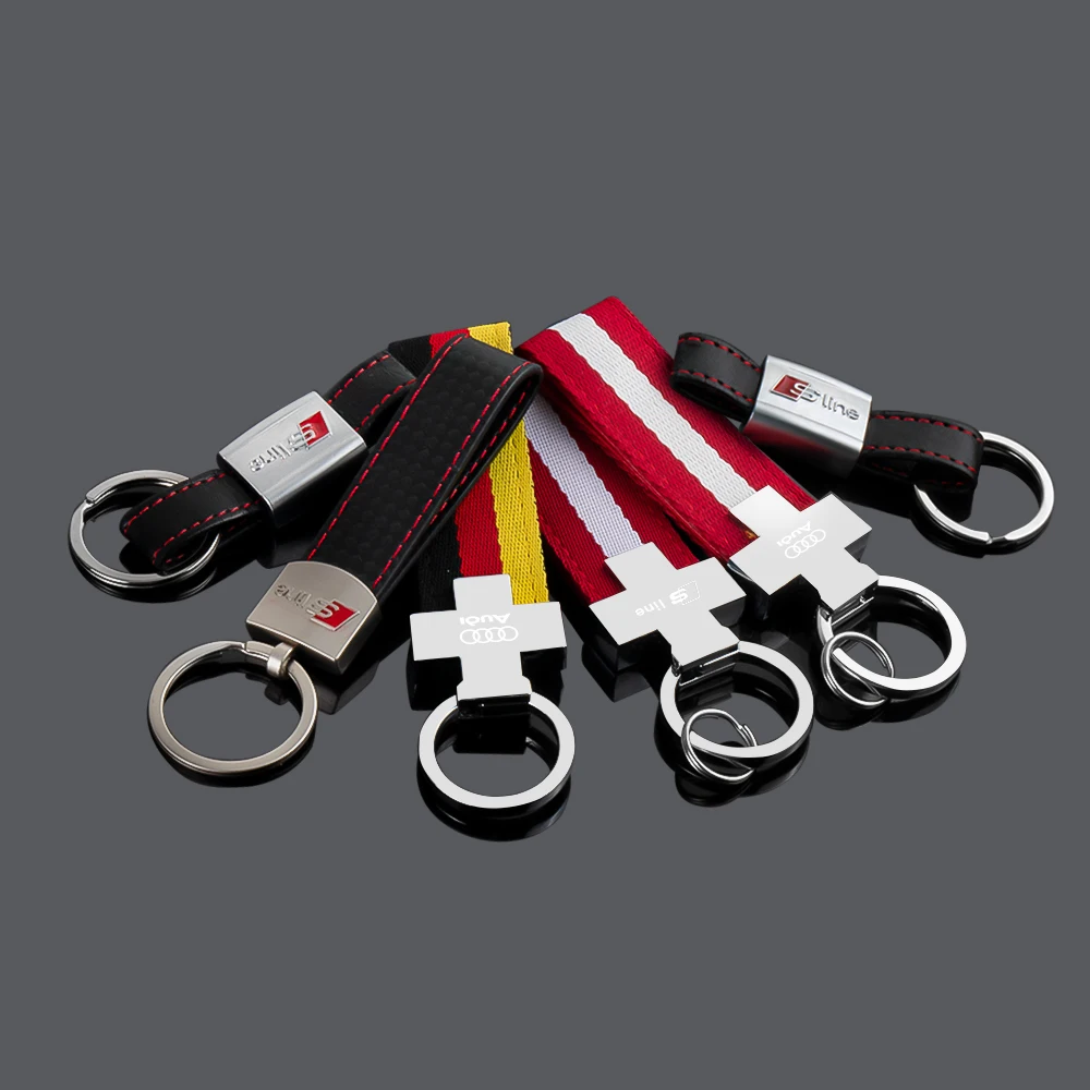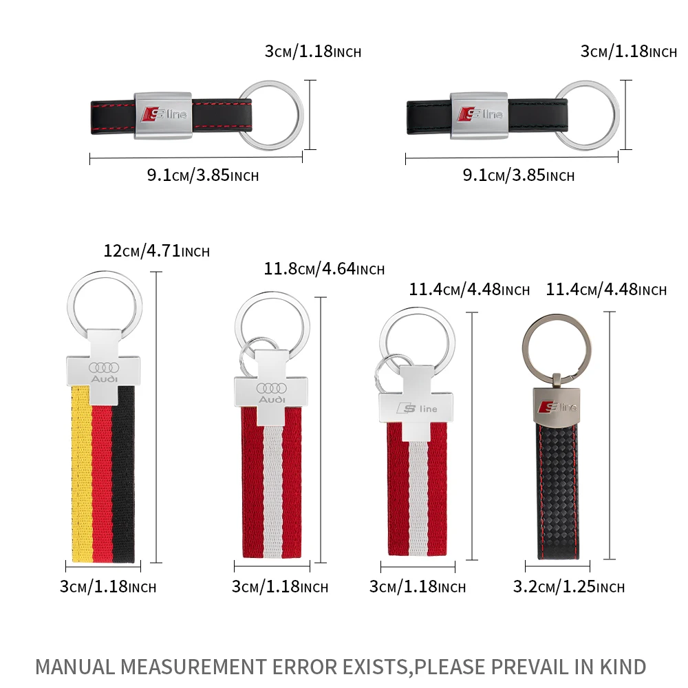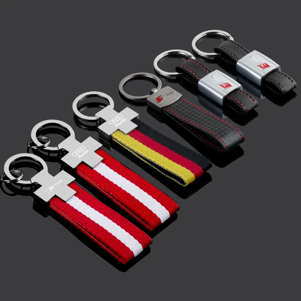 Experience a perfect blend of sportiness and elegance with this high-quality metal car keychain featuring a leather strap. Crafted from durable metal with a polished finish, it measures approximately the dimensions shown in the images and includes textured accents like a carbon fiber pattern and contrasting red stitching. The engraved “S line” branding adds a touch of sophistication. Compatible with vehicle models including A3 (8P, 8V, 8L), A4 (B6, B7, B8, B9), A5, A6 (C5, C6, C7), A7, A8, Q3, Q5, Q7, Q2, along with RS, SQ, and TTS series. Available in stylish options such as “for Germany,” “for RDWH,” “for sline black,” “for sline black red,” and “for sline RDWH,” it’s an ideal accessory for enthusiasts seeking durability, style, and a personal touch.