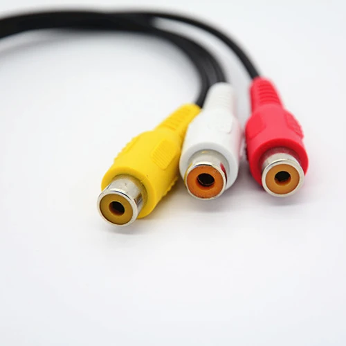 Enhance your connectivity with this 10-inch (27 cm) AV cable featuring a sleek black rubberized sheath, designed to convert 9-pin S-Video signals into three colorful RCA component outputs—yellow for video, white and red for stereo audio. The rounded metallic S-Video connector houses multiple small circular pins arranged in two rows, ensuring reliable signal transmission, while the vibrant RCA connectors with plastic rings provide clear, easy-to-identify connections. Crafted for durability and ease of use, this minimalistic cable is ideal for linking devices with TV output capabilities, offering a straightforward solution for smooth multimedia integration.