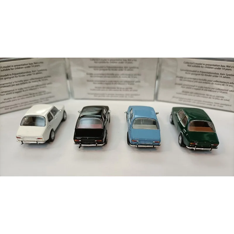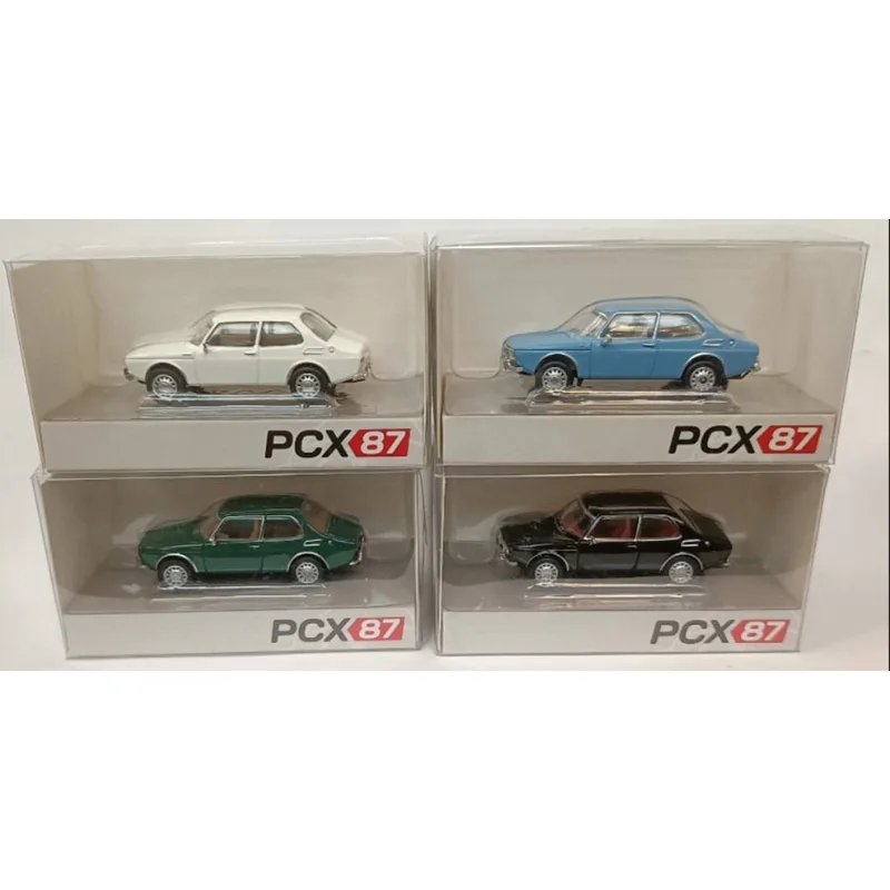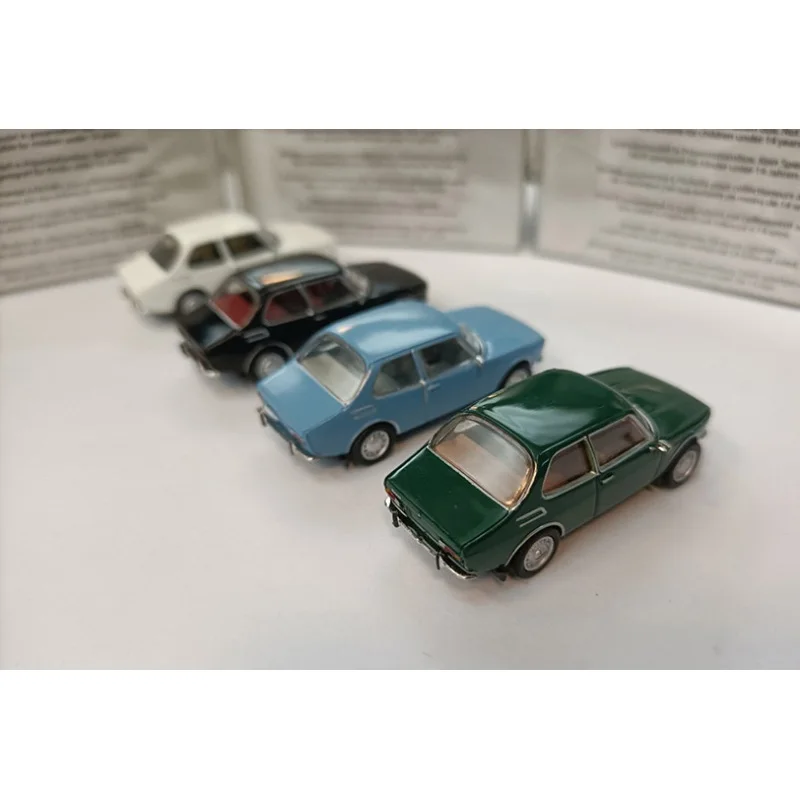Experience the charm of vintage automotive design with this detailed collection of miniature Saab 99 models, expertly crafted in 1:87 scale. These diecast collectible cars boast smooth, rounded body shapes reminiscent of 1980s sedans, featuring realistic proportions. Each model is finished in a distinct vibrant color: classic solid white, glossy black with a metallic sheen, soft shiny sky blue, and metallic green, adding a vibrant touch to any display. Chrome accents enhance the grille, bumpers, and window frames, providing a refined and authentic look. The transparent windows reveal detailed interior elements, while black plastic wheels complement the overall aesthetic. Perfect for collectors and enthusiasts who appreciate detailed, vintage vehicle replicas, these models combine quality with nostalgic appeal.