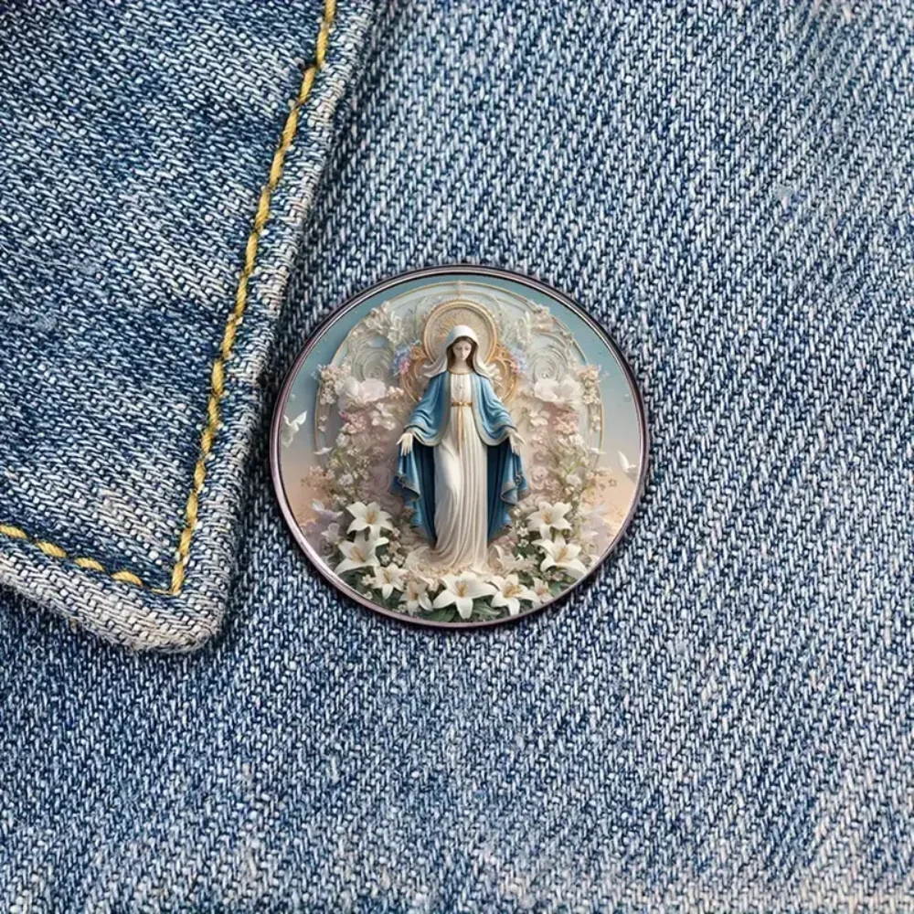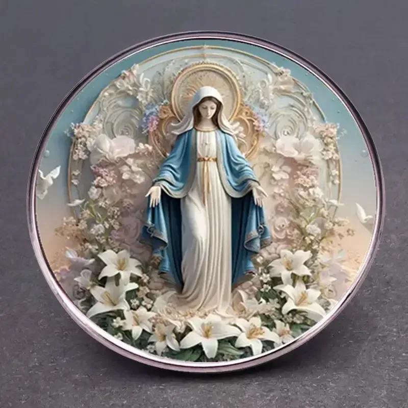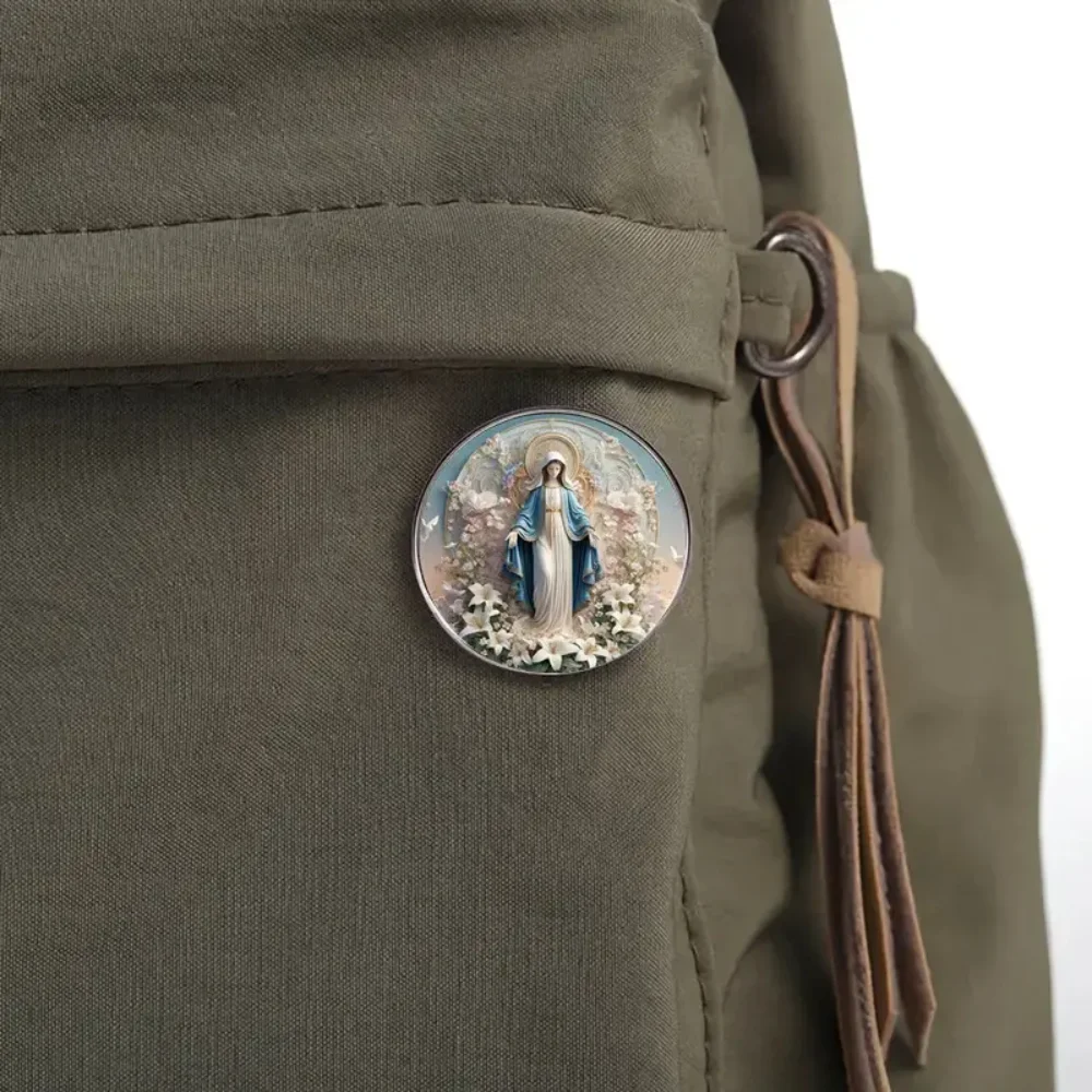 Experience the timeless elegance of our this Sacred Madonna Brooch, crafted from high-quality alloy with a refined silver finish. This vintage-inspired accessory beautifully captures a sacred motif of the Madonna adorned with white lilies and gentle white doves, symbolizing purity and serenity. Its detailed relief highlights the intricate artistry of religious iconography, making it a perfect decorative piece for those who appreciate spiritual and vintage aesthetics. Whether worn on a jacket, attached to a backpack, or added to a hat, this brooch elevates any outfit with its elegant and meaningful design. Its versatile, unisex style appeals to both men and women, adding a touch of refinement and sacred symbolism to your daily wardrobe. Designed for adult collectors and enthusiasts seeking a meaningful accessory with a vintage charm.