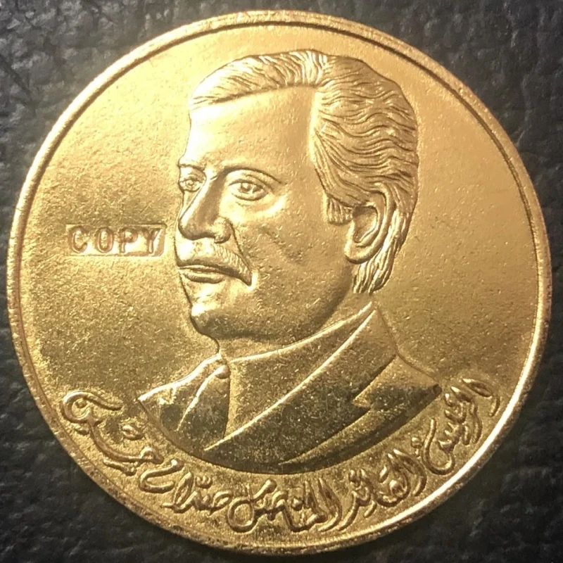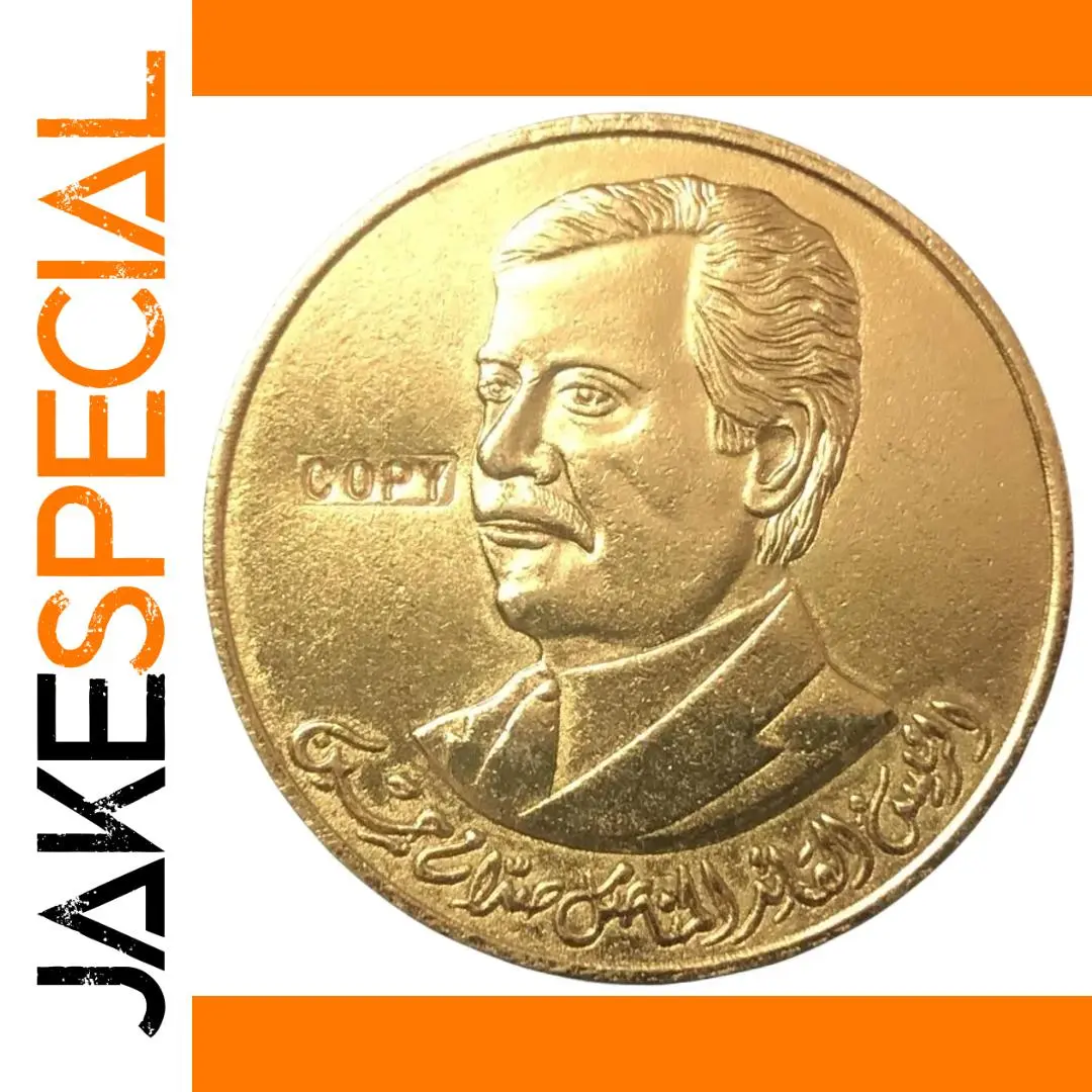 Own a striking collectible with this detailed replica coin modeled after the 1980s Iraqi 50 Dinars featuring President Saddam Hussein. Crafted from metal using casting techniques, it boasts an antique-style design with a shiny, reflective finish that highlights its intricate relief work. The coin features a finely detailed profile of Saddam Hussein in military uniform, with facial features, hair, and uniform lines meticulously rendered. Embossed Arabic script along the bottom rim and a rectangular “COPY” mark add authenticity to this vintage-inspired piece. Perfect for collectors or display, this replica offers a vivid, historical aesthetic in a seamless round shape with a smooth, rounded edge.