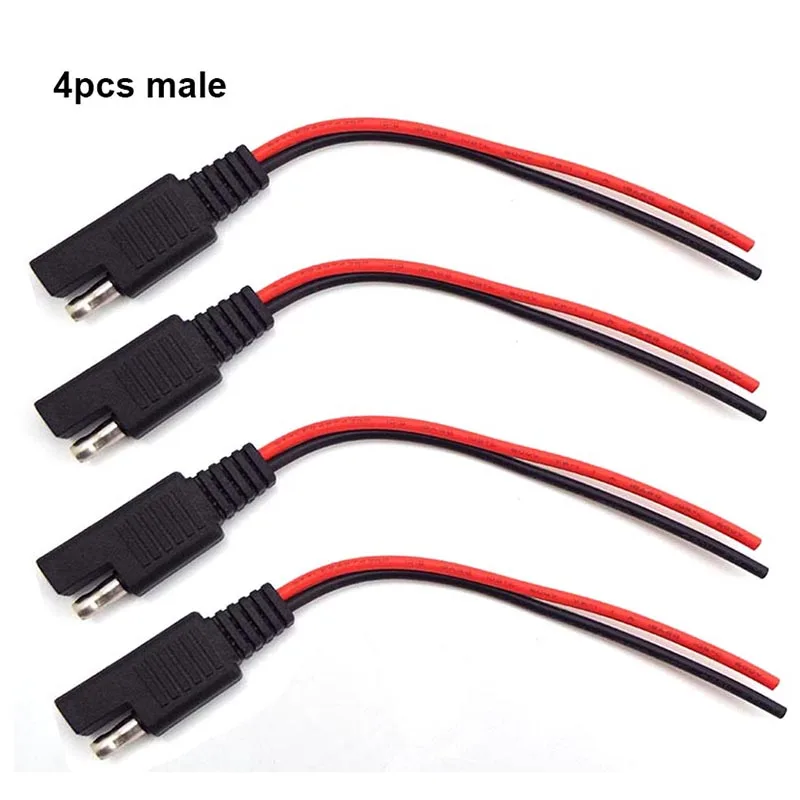 This this SAE male and female extension cable set offers a practical solution for your automotive, solar, or DIY power projects. Designed with durable 18AWG copper wiring, these cables ensure efficient power transfer at a standard 12V operating voltage. Each cable features a sleek black and red insulation, clearly indicating negative and positive polarities for safe and easy connections. With a total length of approximately 15cm including connectors, they provide ample reach for flexible installations. The black plastic inline connectors incorporate a sliding latch for secure, quick coupling and decoupling. Perfect for enhancing your power setup, these cables combine simplicity, durability, and reliable electrical performance, making them ideal for solar battery systems, automotive wiring, or other low-voltage electrical applications.