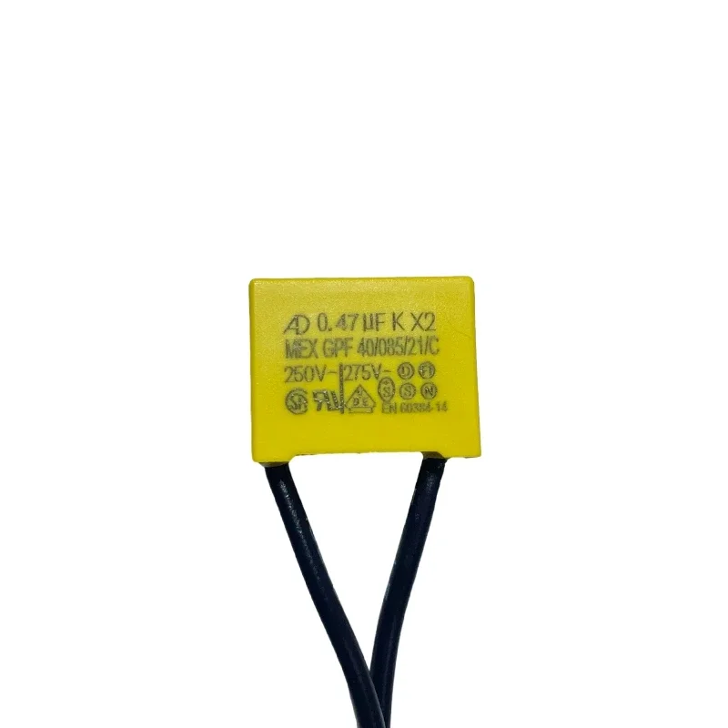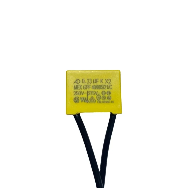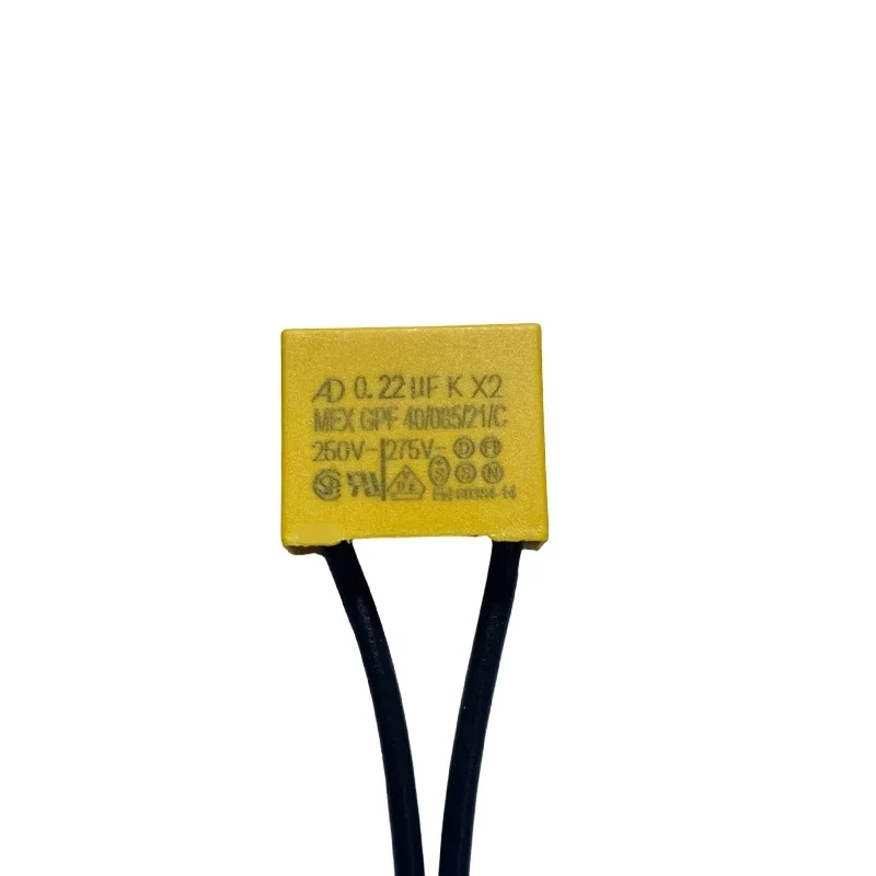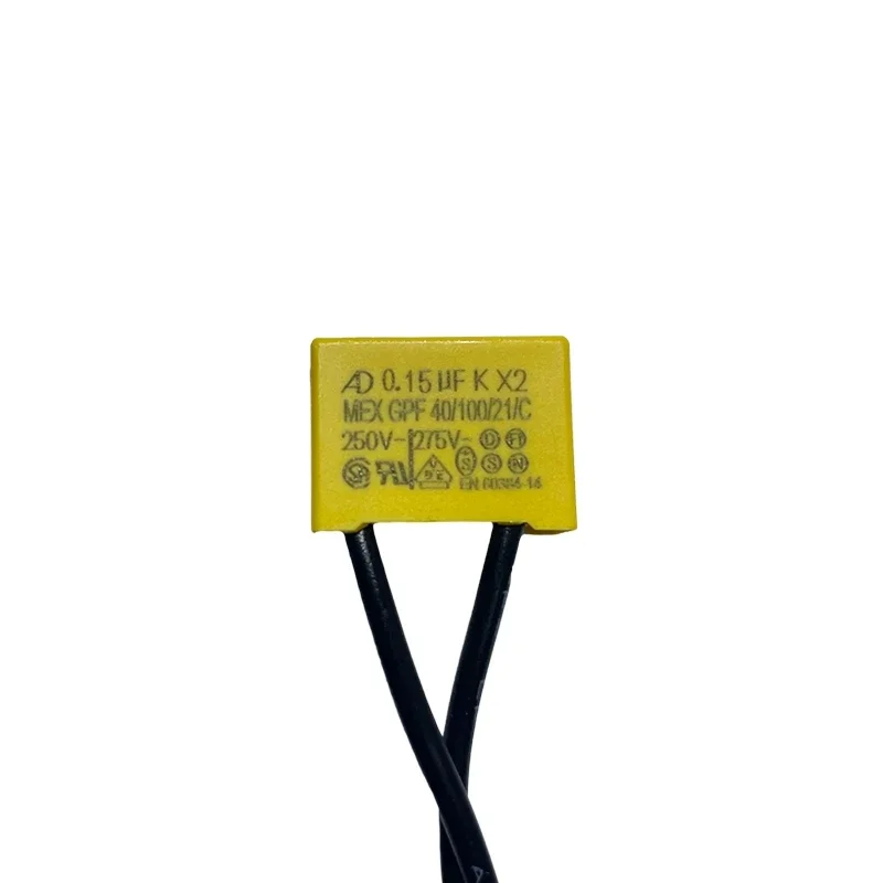 Picture yourself installing these essential safety film capacitors, enhancing electrical safety in your projects. Crafted with a bright yellow exterior for high visibility, each capacitor boasts a smooth, flat surface with clear black printed labels, including capacitance, voltage ratings, and safety symbols. The flexible black wires extending downward connect seamlessly to your circuits, making installation straightforward and secure. Perfect for general electrical applications, these capacitors are reliable, efficient, and designed to meet safety standards. They are ideal for circuit protection, noise suppression, and voltage filtering, providing peace of mind during operation. With their sturdy construction and customizable features, you can confidently integrate them into your electrical systems, ensuring durability and safety.