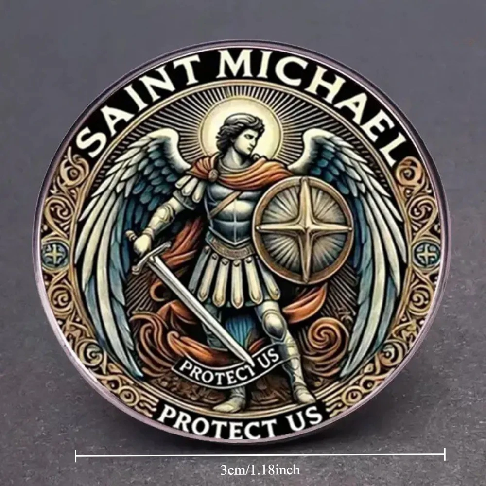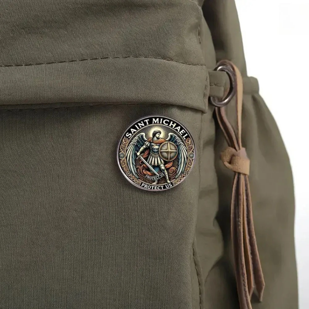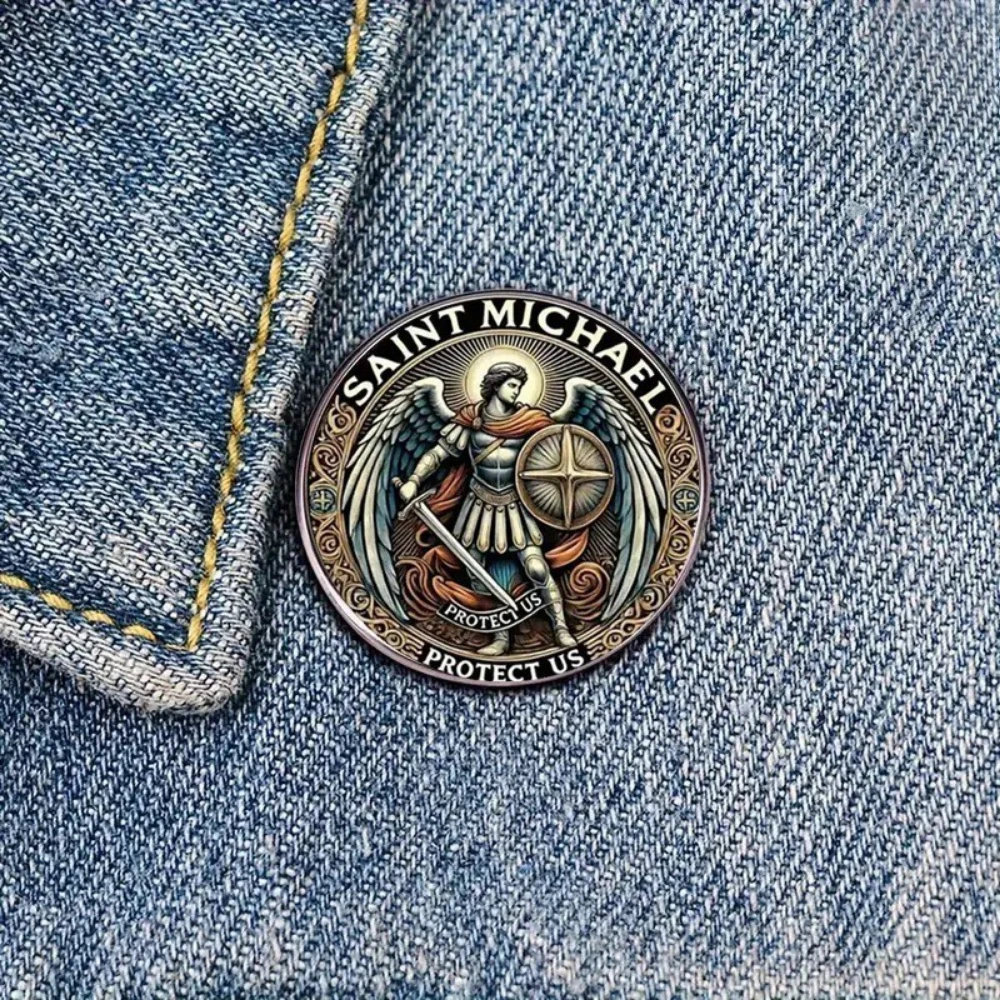 Imagine elevating your wardrobe with this striking Saint Michael's Guardian brooch, a perfect symbol of protection and strength. Crafted from durable alloy with a sleek silver finish, this round decorative accessory embodies a blend of gothic, medieval, patriotic, and vintage aesthetics. The intricate design features Saint Michael in a heroic stance, surrounded by ornate swirling patterns in gold and black, creating a captivating contrast. Its flat, polished surface gives a refined and timeless appeal, making it suitable for various styles including retro, Viking, military, punk, gothic, or minimalist. Whether pinned on a jacket, backpack, or hat, this brooch adds a touch of elegance and powerful symbolism to your everyday look. Feel confident knowing you carry a meaningful piece that resonates with your personal style.