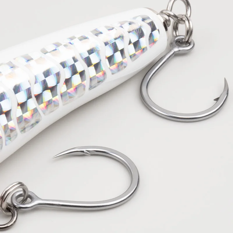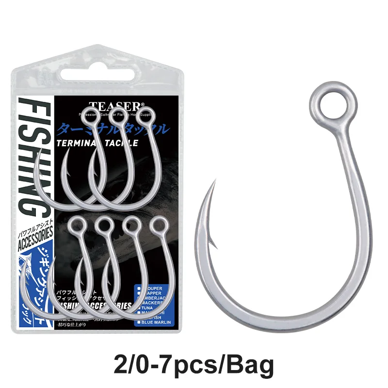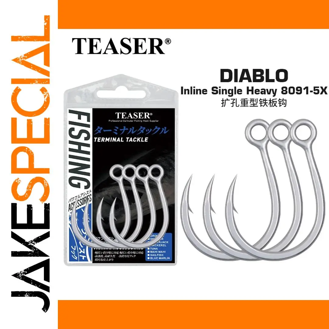 Experience superior saltwater fishing with these high-carbon steel TEASER DIABLO inline hooks, available in sizes 2/0 (7 pcs), 3/0 (6 pcs), 4/0 (5 pcs), 5/0 (5 pcs), and 7/0 (4 pcs). Designed with a heavy-duty, inline Diablo shape, these lightweight yet robust hooks feature prominent barbs for enhanced grip and a sleek metallic silver finish that resists corrosion thanks to advanced rust-proof technology. Perfectly suited for ocean boat fishing, their easy-to-use design makes them ideal for both novice and seasoned anglers aiming for reliable catches in challenging saltwater environments.