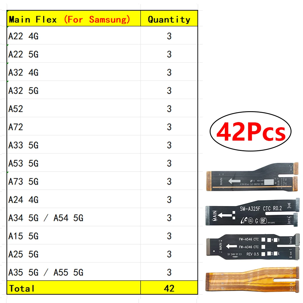 Enhance your device’s performance with this set of 28 flexible motherboard cables, expertly designed for a range of Samsung models including A22, A32, A52, A72, A33, A53, A73, A24, A34, A54, A15, A25, A35, and A55, compatible with both 4G and 5G variants. These durable, bar-shaped flex cables feature a sleek matte black finish with white printed labels for precise identification, and a distinctive transparent yellow-orange cable that reveals internal conductive traces for a modern, technical look. Each cable is rigorously tested before shipping, ensuring quality and reliability for seamless repairs or upgrades.
