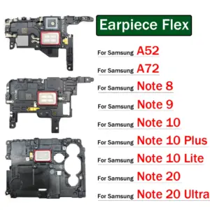 Transform your calling experience with this premium replacement ear piece speaker for Samsung devices. Designed with precision, this high-quality part ensures crystal-clear audio, making every call clear and effortless. Crafted to fit specific models such as the A52 4G, A72, Note 8, Note 9, Note 10, Note 10 Lite, Note 10 Plus, Note 20, and Note 20 Ultra, this component seamlessly restores your phone's original sound quality. Its sleek black rectangular shape features intricate cutouts and electronic circuitry visible on the surface, giving a modern, technical aesthetic that matches your device’s internal parts. The housing, made of durable matte black plastic, houses the delicate electronic components while providing a streamlined look. Easy to install, it’s perfect for those seeking a reliable, long-lasting repair solution to bring their phone back to life.