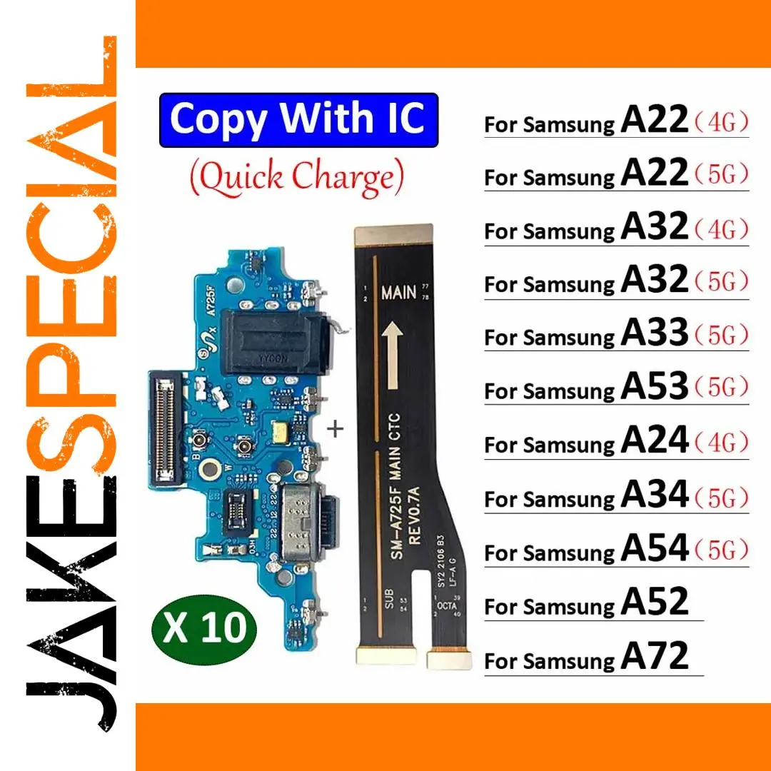 Upgrade your Samsung device effortlessly with this set of ten high-quality replacement dock connector flex cables. Designed for compatibility with models such as A22 4G/5G, A24 4G, A32 4G/5G, A33 5G, A34 5G, A52, A53 5G, A54 5G, and A72, these flex cables are perfect for restoring power to your smartphone. Crafted from flexible, insulated material, each cable features a slim, rectangular bar shape that ensures a precise fit. The elegant black finish is accented with tiny gold-colored contact points, and the cables include integrated electronic components. These components are deliberately designed to facilitate easy installation and reliable performance, seamlessly blending functionality with sleek aesthetics. Whether you're repairing or replacing, this set provides all you need for a professional-grade fix to keep your device charging smoothly and efficiently.