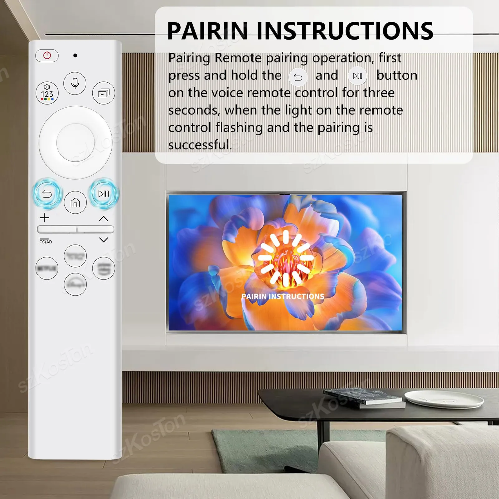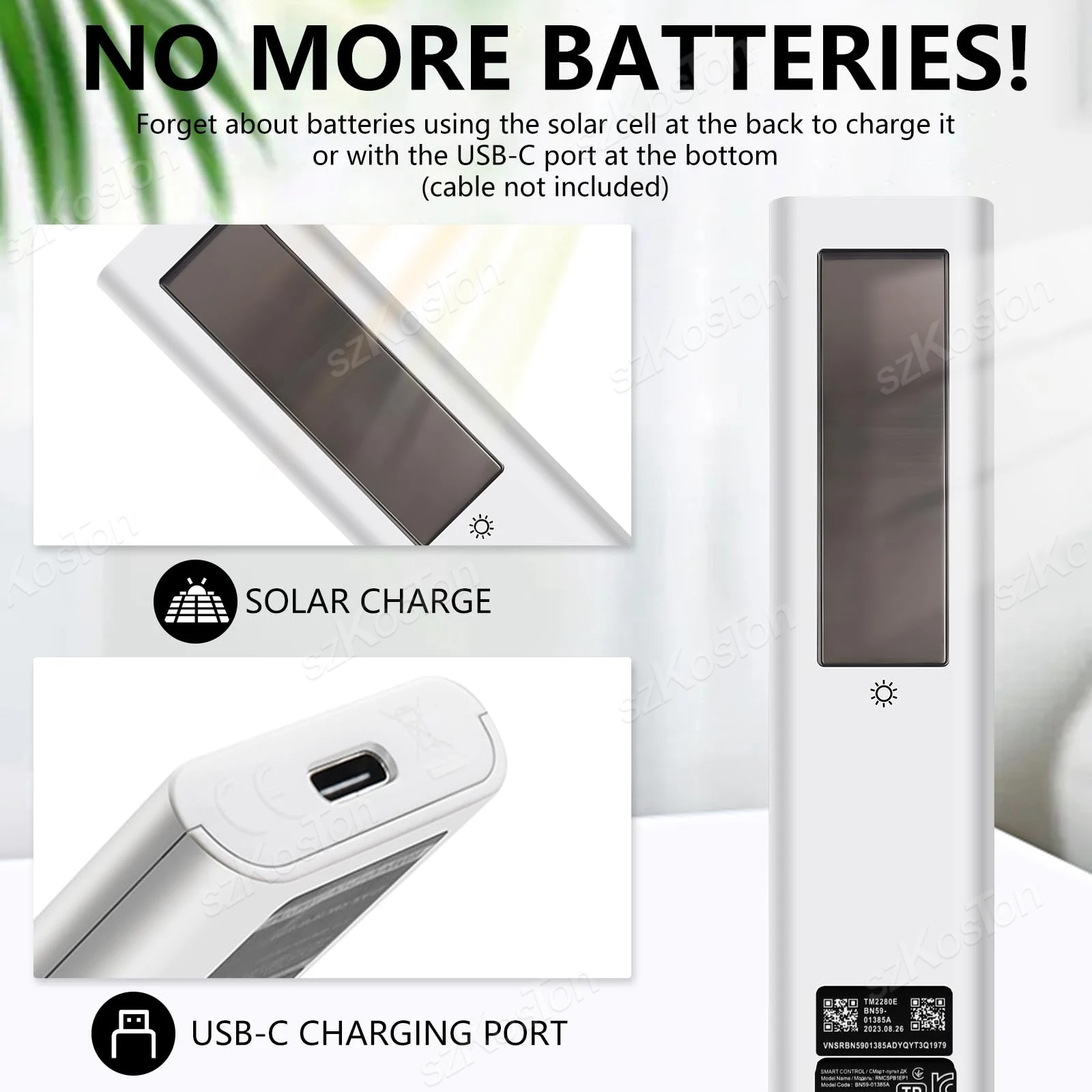 The Replacement BN59-01391A Solar Voice Remote is expertly designed for Samsung Smart TVs, particularly the Frame models. It features a sleek, predominantly white exterior, an intuitive circular navigation pad, and a microphone button for voice search, highlighted by a blue circular outline when activated. This remote also includes essential function buttons, such as a power button and playback controls, ensuring effortless access to your favorite apps. With its innovative solar charging capability and wireless IR communication, this remote not only enhances your viewing experience but also offers a user-friendly interface and modern aesthetic, perfect for your home entertainment setup.
