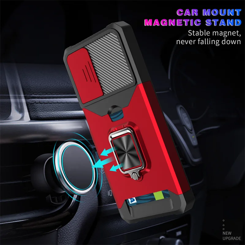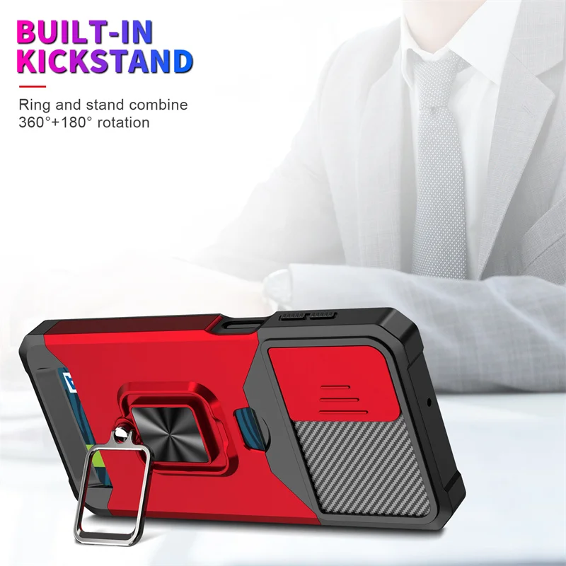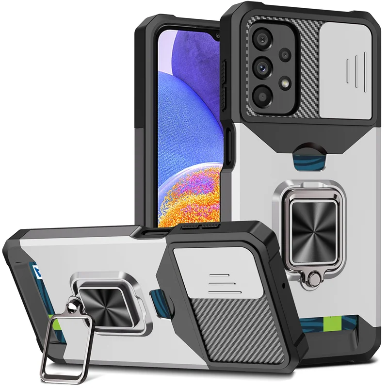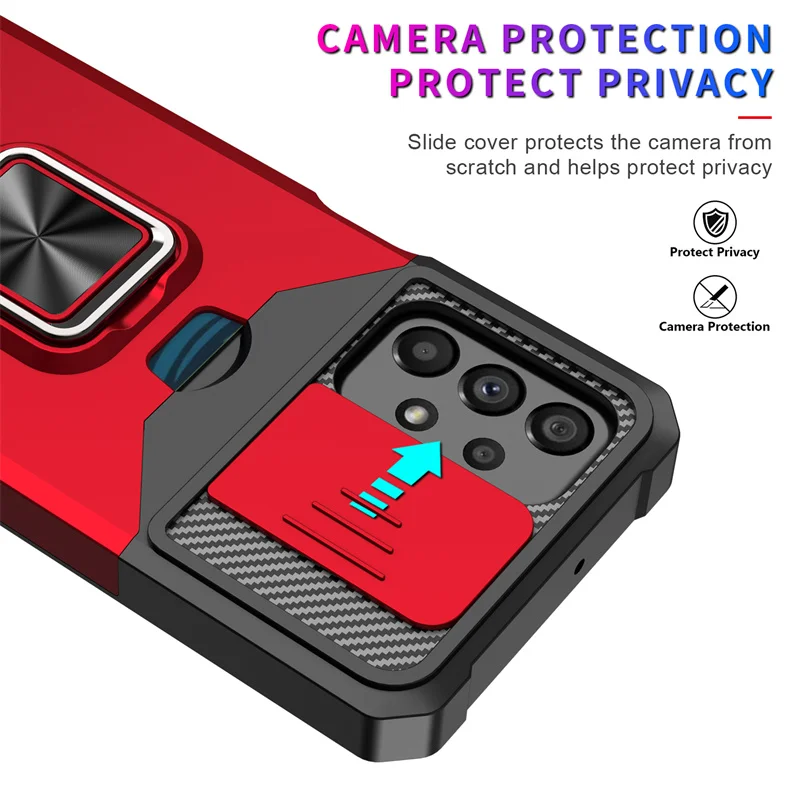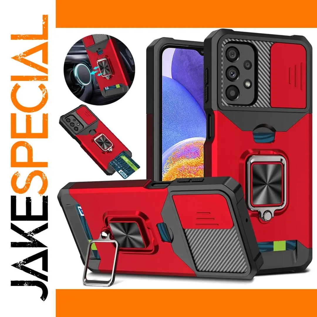 Elevate your Samsung Galaxy phone with this rugged, multi-functional protective case, designed for models A13 5G, A23 4G/5G, A33 5G, and A53 5G. Featuring a bold, sporty aesthetic, the case combines vibrant colors like Rose Gold, Blue, Green, Black, Silver, Red, and Gold with textured carbon fiber-like accents. Its durable construction includes a multi-layer shockproof hybrid armor, anti-scratch and anti-fingerprint surfaces, and reinforced bumpers for superior impact resistance. The full coverage design offers a slide window for camera lens protection and a sturdy, 360-degree metal ring stand that doubles as a magnetic car mount. With card slots, a non-slip textured surface, and a convenient kickstand, this case perfectly balances style and heavy-duty protection for your device.