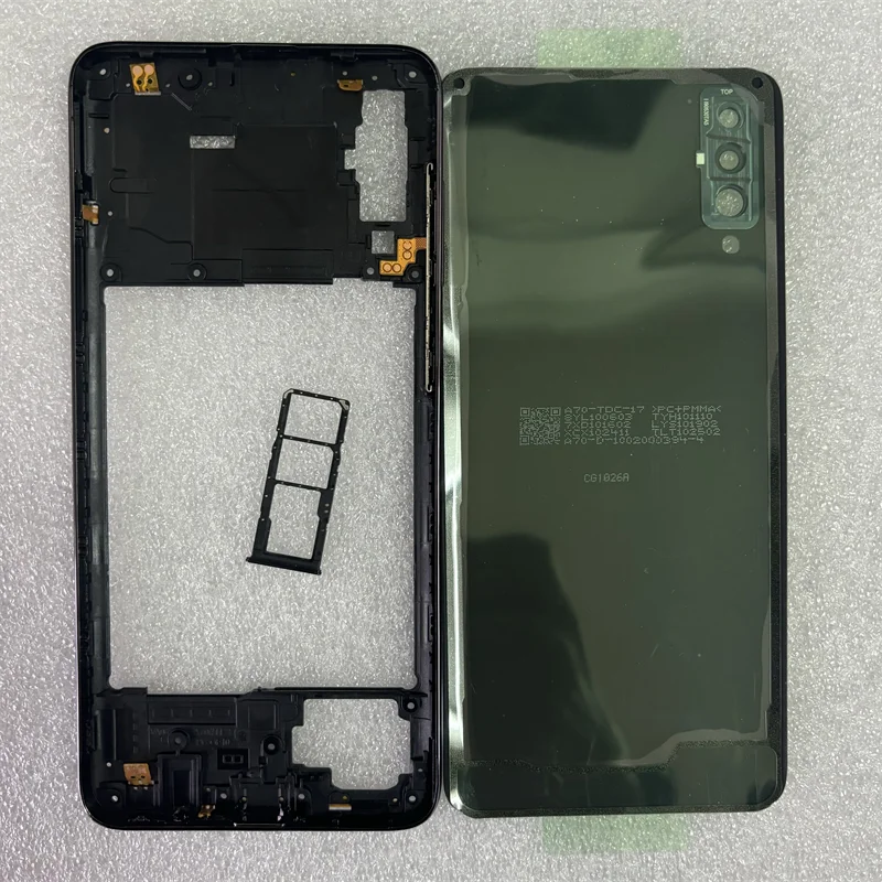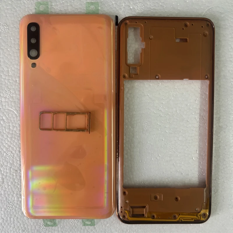 This housing case is specifically designed for the Samsung Galaxy A50, compatible with model numbers A505, A505F, and A505DS. It features a glossy rear cover with a dynamic gradient of colors, likely in dark shades such as black or deep blue, along with three vertically aligned camera cutouts and a flash dot. It includes a matte finish middle frame, primarily black, designed for securing internal components, including openings for the battery compartment and SIM card tray. Available colors include White, Gold, Black, and Blue. Professional installation is recommended to ensure proper replacement without damage.