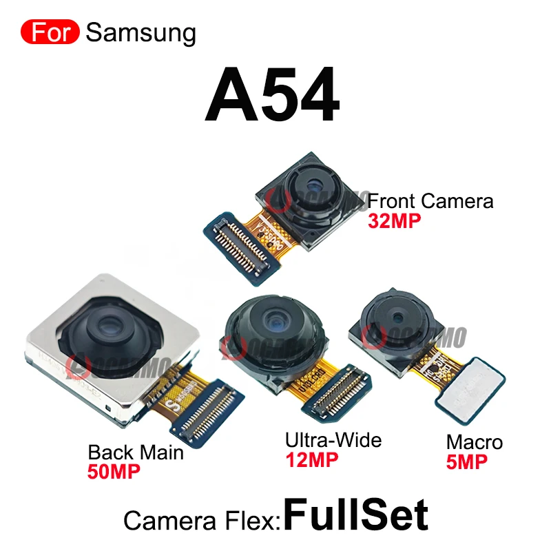 Experience seamless photography with this high-quality replacement flex module designed specifically for the Samsung Galaxy A54. It includes both front and rear camera components, allowing you to restore or enhance your device's imaging capabilities. The rear section features a main 50MP camera, a 12MP ultra-wide lens, and a compact 5MP macro lens, all built with original quality standards for exceptional photo clarity. The front camera offers a sharp 32MP lens for clear selfies and video calls. The sleek bar design emphasizes modernity with clean lines and a refined appearance, complemented by gold accents on the flex cables. Perfectly compatible and easy to install, this set helps you maintain your device's aesthetic and functionality effortlessly.