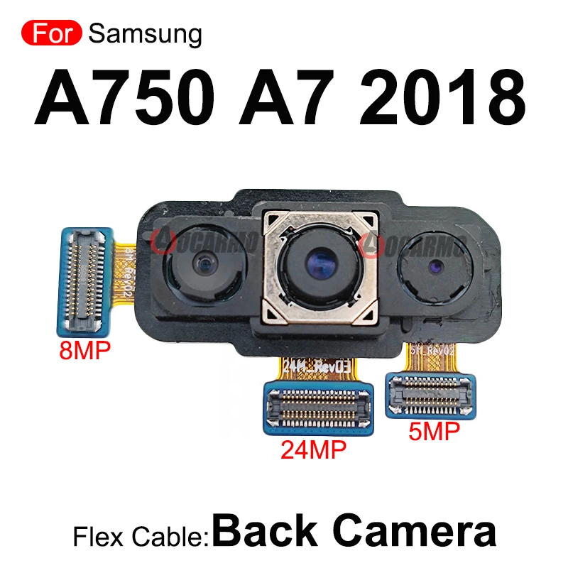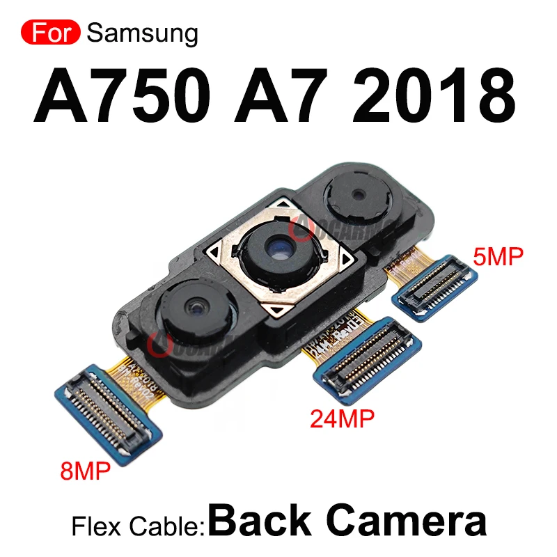 - Component specifications include compatibility with Samsung Galaxy A7 2018 (Model A750), with technical details ensuring precise fitment and functionality for rear camera needs.