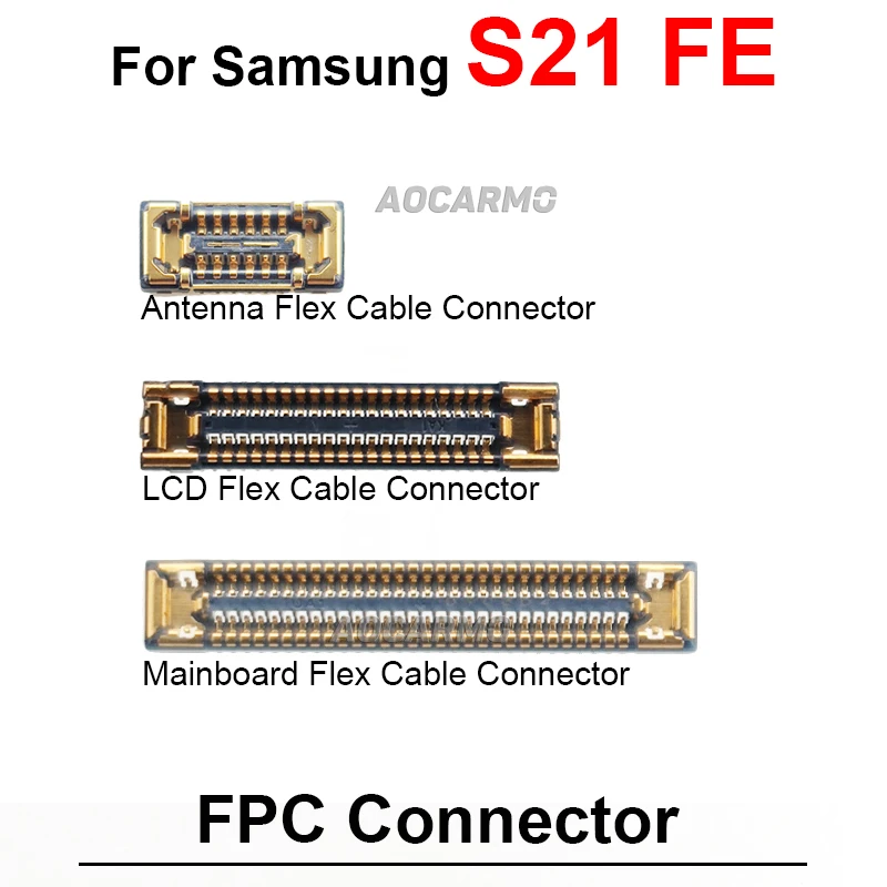 Take pride in your Samsung Galaxy S21 FE 5G with our premium set of flex cable connectors. Designed specifically for this model, these connectors enhance the performance of your device. The top antenna connector ensures strong connectivity, while the LCD connector guarantees optimal display performance, and the mainboard connector connects crucial internal components. Crafted with high-quality materials, they offer durability and reliability. Each connector is meticulously constructed, featuring a metallic finish that not only looks sophisticated but also provides excellent electrical conductivity. Upgrade your device's functionality and enjoy seamless usage with these essential components tailored for the Samsung Galaxy S21 FE 5G.