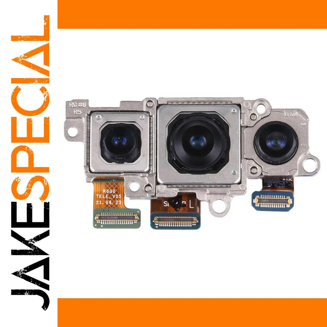 Enhance your Samsung Galaxy S22 5G with this high-quality camera set, including a telephoto, wide, and main camera designed specifically for model SM-S901B. Crafted with precision, each component features dark, reflective lens elements housed in distinct geometric shapes—square with rounded edges, octagonal, and circular—creating a sleek and modern aesthetic. The robust metallic frame with precise cutouts ensures a perfect fit and durable assembly. This replacement part has been thoroughly inspected for quality and compatibility, providing a seamless camera upgrade. Professional installation is highly recommended to ensure optimal performance and to avoid potential damage during setup.