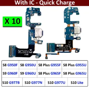 Enhance your Samsung device with this set of 10 high-quality flex cables, compatible with models S8 G950F and G950U, S8 Plus G955F and G955U, S9 G960F and G960U, as well as S9 Plus G965F and G965U. Each cable features a sleek bar shape and includes a USB charger dock connector, charging port, and microphone, ensuring reliable performance. Designed for precise compatibility with Samsung smartphones, all units are rigorously tested prior to shipping to guarantee top-notch quality. These replacement flex cables are essential for restoring optimal charging and microphone functions, providing a trusted solution for device maintenance and repair.