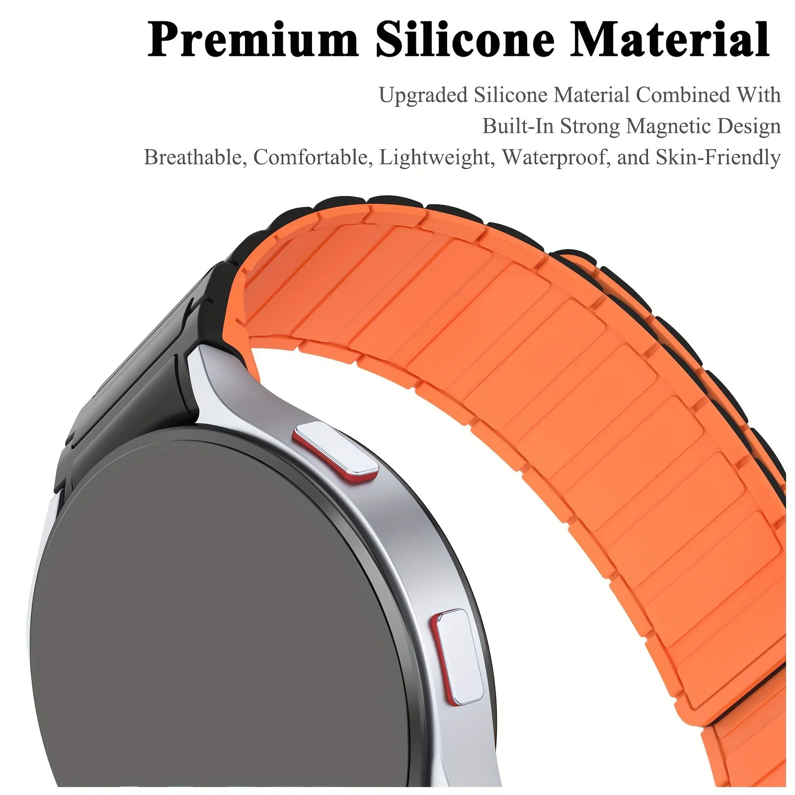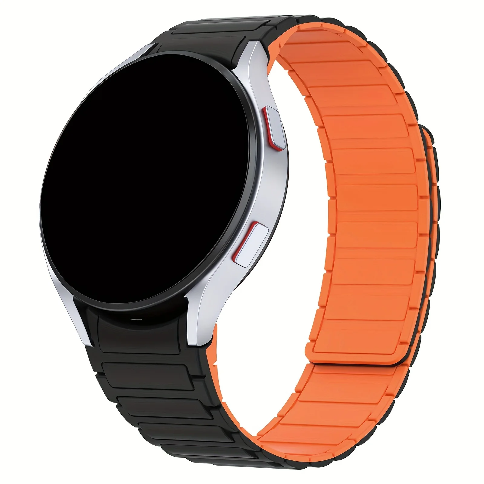 Imagine seamlessly upgrading your Samsung Galaxy Watch with this sleek, no-gap silicone band. Designed for style and comfort, it offers a smooth, continuous surface that conforms perfectly to your wrist. The bold contrast of a black base with vibrant orange accents on the inner cuff adds a sporty touch, making it ideal for everyday wear or active pursuits. Crafted from durable silicone, this unisex strap is lightweight and flexible, providing all-day comfort. The magnetic clasp ensures a secure, adjustable fit, so you can enjoy both practicality and elegance. Compatible with various Galaxy Watch models, it’s the perfect accessory to enhance your smartwatch experience and reflect your personal style.