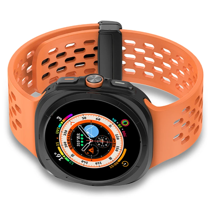 Experience the perfect blend of modern design and practical functionality with this silicone strap, crafted specifically for the Samsung Galaxy Watch Ultra 47mm (model number). The strap’s layered perforated pattern enhances breathability, making it suitable for active daily use and sports. Its vibrant color options, including army green, black, fluorescent green, and more, allow you to personalize your style effortlessly. The strap features a seamless magnetic clasp, providing a secure, gapless fit that adjusts easily to your wrist. Made from durable, chemical-free silicone, it ensures comfort and safety during extended wear. Elevate your smartwatch experience with this highly versatile and stylish accessory.