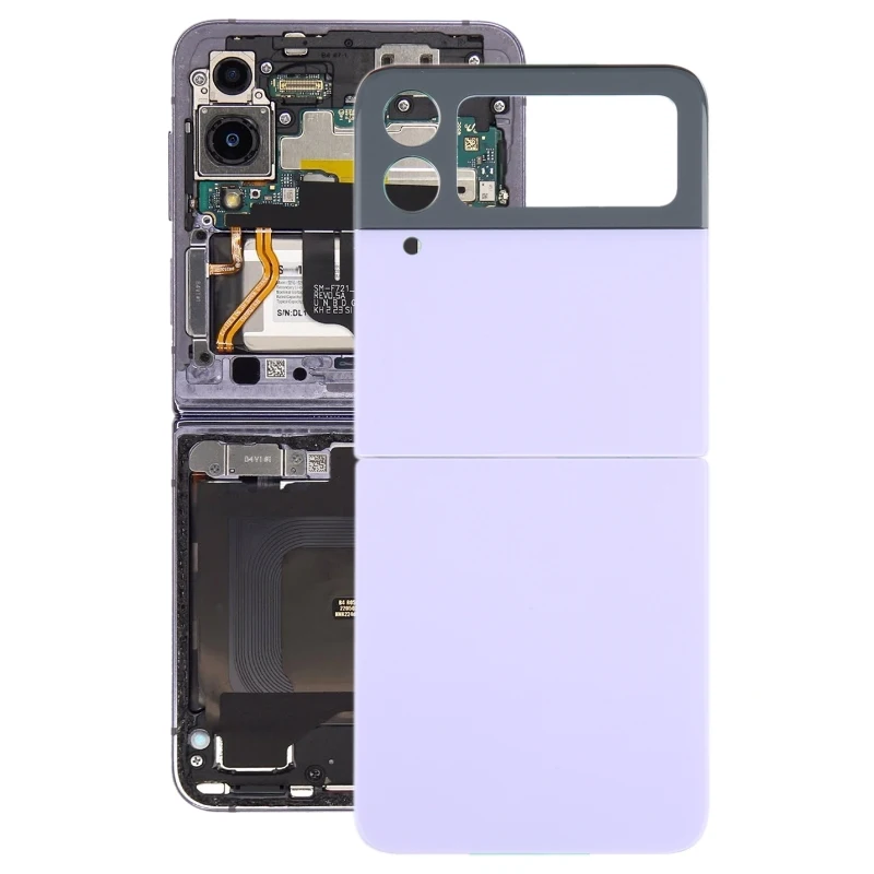 Enhance and restore your Samsung Galaxy Z Flip4 (SM-F721B) with this high-quality replacement back cover, available in black, purple, golden, and blue. Designed for a precise fit, it includes a camera lens cover and is ideal for replacing damaged or malfunctioning rear housing cases and battery covers. Crafted with attention to detail, the cover features a smooth, uniform surface with a sleek, modern aesthetic, complemented by neatly organized internal components visible through the internal layout. Each part undergoes thorough inspection before shipping, ensuring optimal condition and compatibility. Installation should be performed by qualified professionals to maintain integrity and functionality of your device.