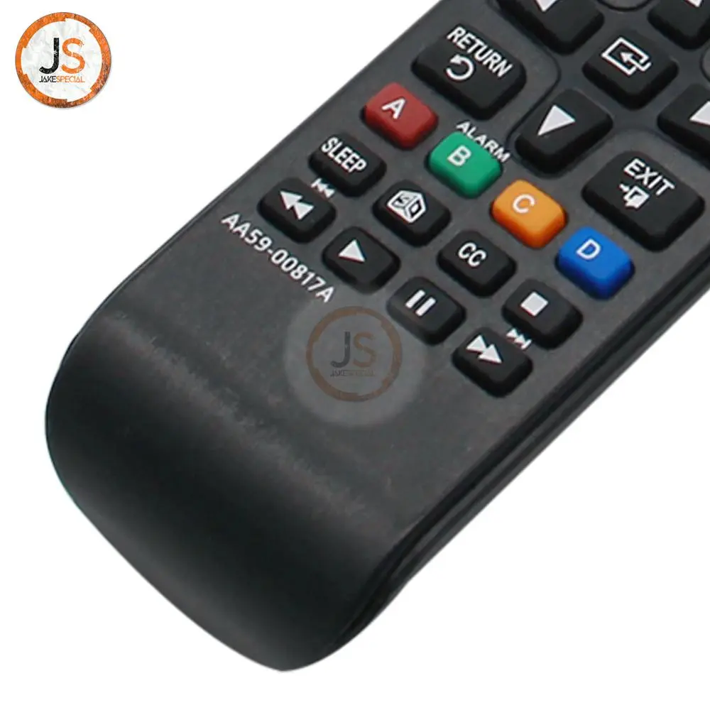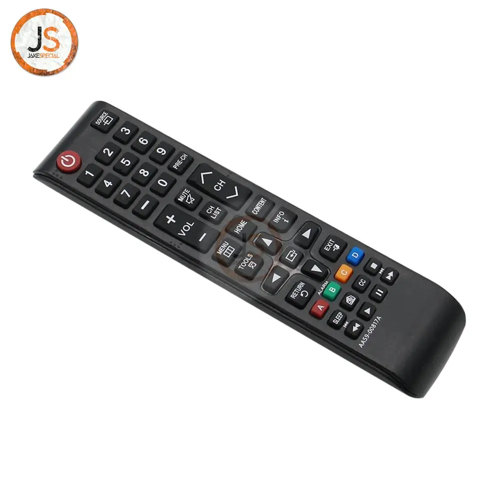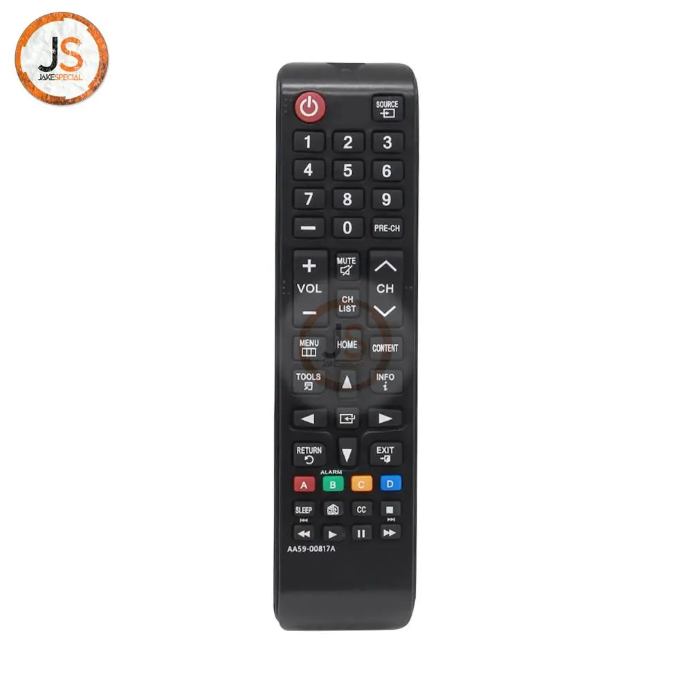 Experience effortless control over your Samsung Smart TV with this sleek remote control model AA59-00817A. Designed with a modern black exterior, it features an elongated shape that fits comfortably in your hand. The prominent red power button stands out, making it easy to find even in low light. With a well-organized layout, including a numeric keypad, directional buttons, and color-coded function keys, navigating channels and menus becomes a breeze. Enjoy robust functionality, enhanced by infrared (IR) wireless communication, providing seamless interaction with compatible models for an optimized viewing experience.