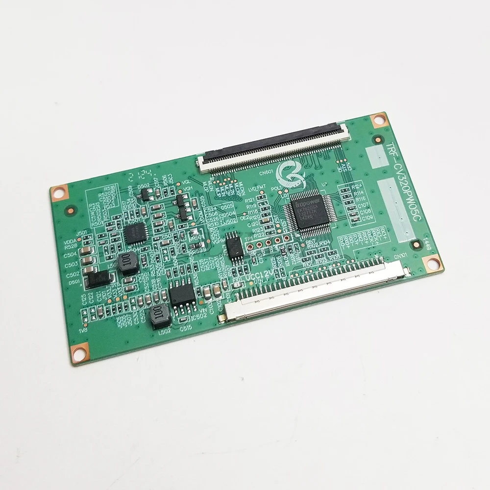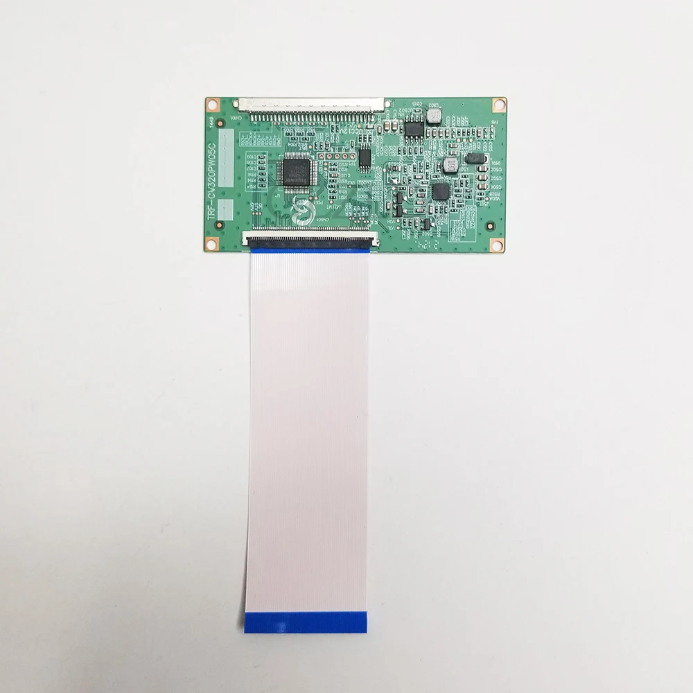 Experience seamless replacement with this high-quality Samsung TV logic board, model TRF-CV320PW05C. Crafted for compatibility with TV screens featuring the CV320PW05S panel, this PCB combines precision engineering with a sleek, industrial design. Its vibrant green surface is densely populated with surface-mounted resistors, capacitors, and integrated circuits, arranged meticulously for optimal performance. Prominent black chips contrast vividly against the green, while crisp white silkscreen markings guide technicians with clarity. The inclusion of a long, white flat flexible cable with blue edges complements the grounded, detailed structure of the circuit. With its professional-grade construction and thoughtful design, this board promises reliable, durable operation for your entertainment setup.