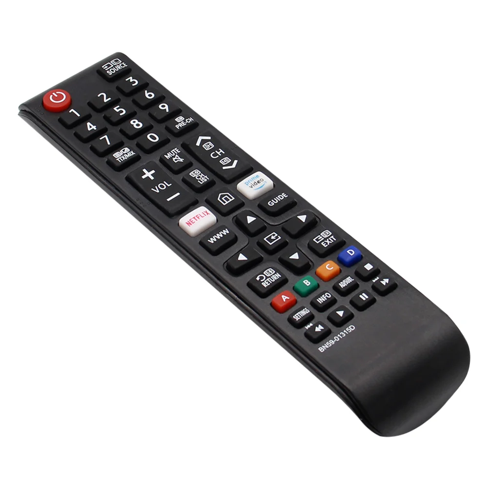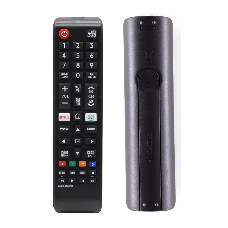 Experience the convenience of controlling your Samsung 4K Smart TV effortlessly with this universal remote control, model BN59-01315D. Designed predominantly in sleek black, its elongated shape and well-organized button layout ensure effortless navigation. The remote operates on a 433 MHz frequency and uses infrared communication for a reliable connection, allowing you to access functions like Netflix and Prime Video with dedicated buttons. There's no need for programming or pairing; just insert 2 AAA batteries (not included), and you're ready to go. With substantial compatibility with numerous Samsung models, this remote will fit perfectly in your home entertainment setup, enhancing your viewing pleasure.