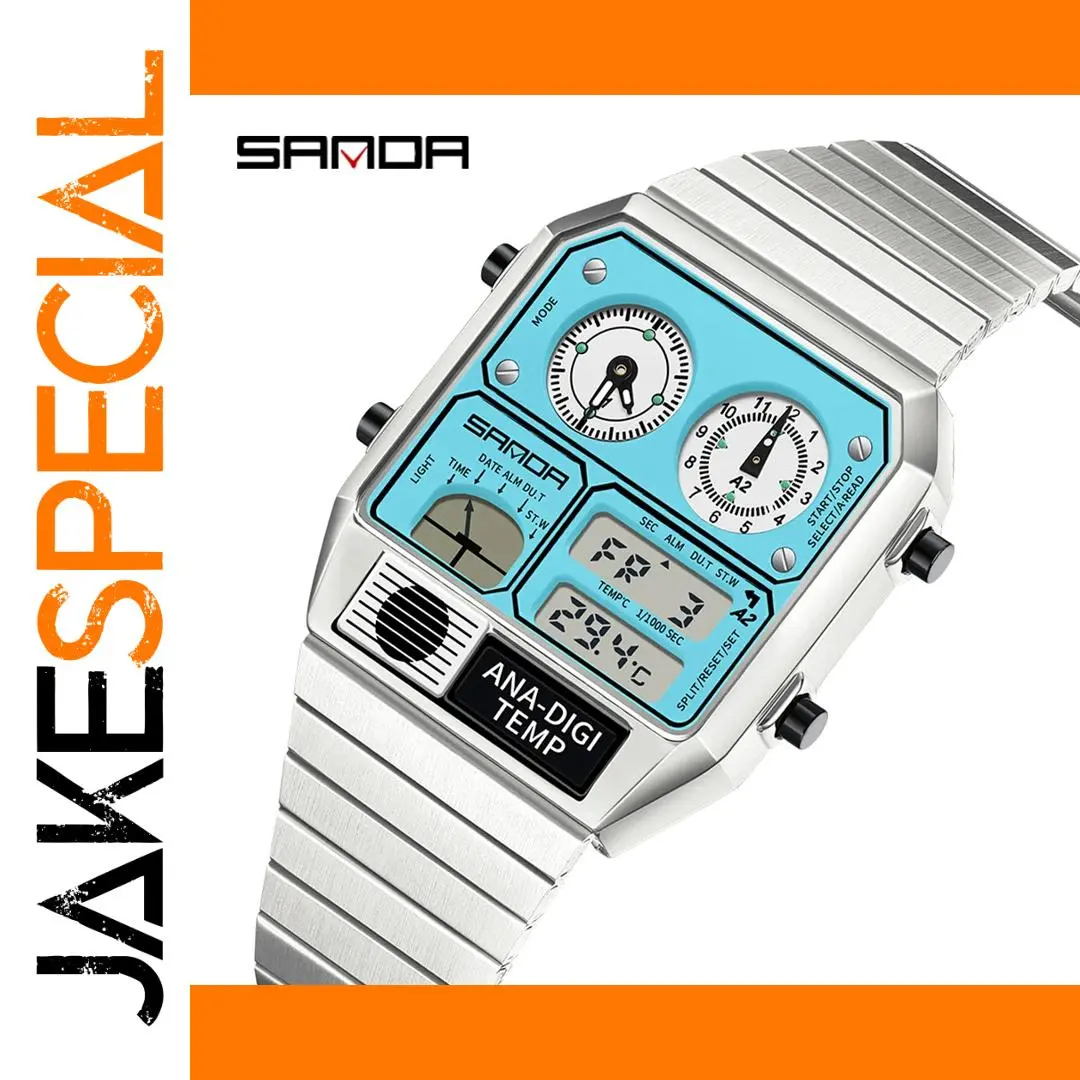 The SANDA 3192 Men’s Watch is an eye-catching blend of style and technology, designed for those who appreciate both aesthetics and function. Its sleek square stainless steel case in polished silver is complemented by a vibrant turquoise watch face, making it a perfect accessory for any outfit. Featuring both analog and digital displays, this watch showcases the current time, temperature, and other essential functions. With a durable stainless steel bracelet, it promises not only style but longevity. Perfect for casual outings or more formal events, owning this watch will surely elevate your fashion game and simplify your day-to-day life.
