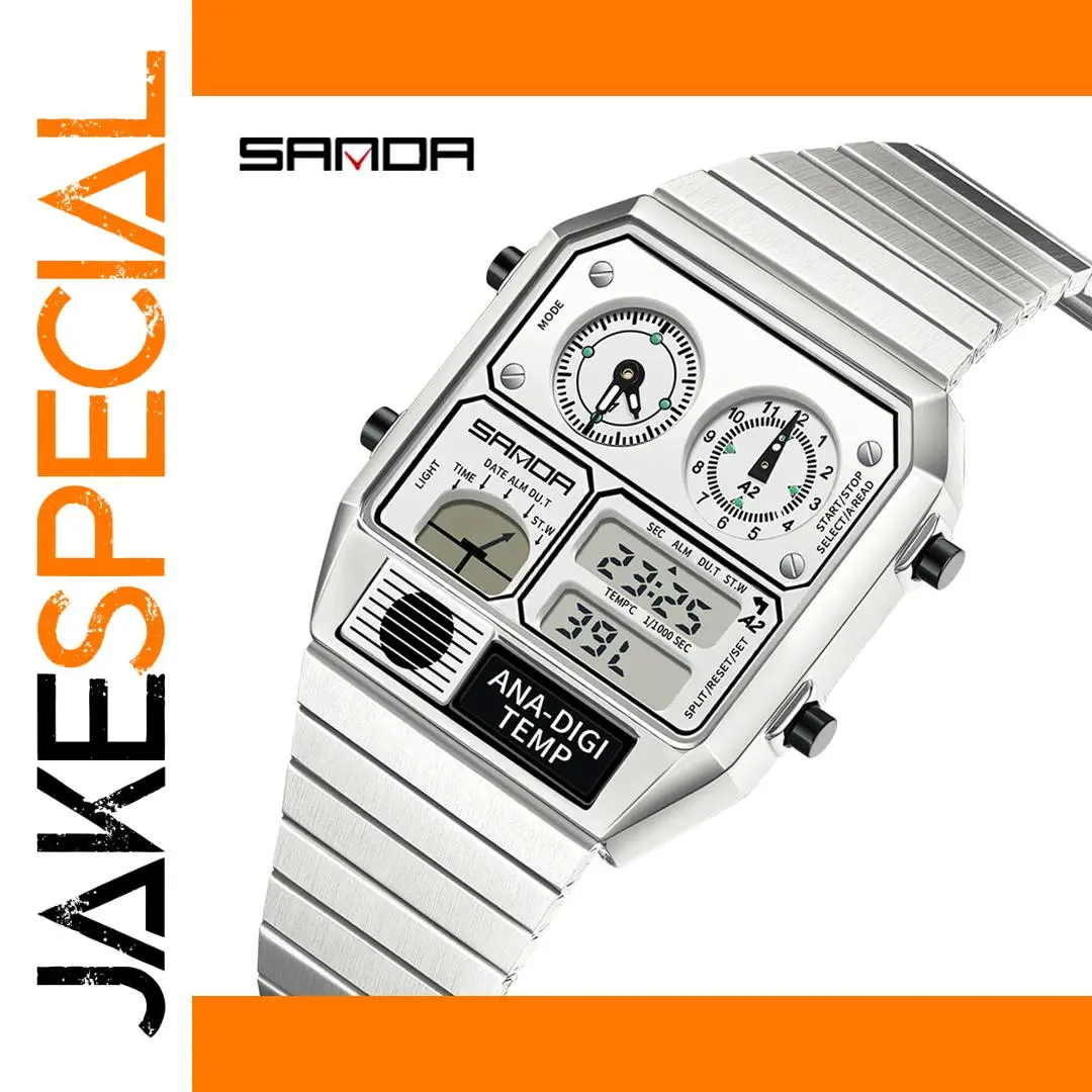 Imagine yourself wearing the sleek SANDA 3192 LED electronic watch, a stunning blend of contemporary design and functionality. With its striking square alloy case in a polished silver finish, you'll effortlessly elevate your casual or formal attire. The unique analog-digital display keeps you informed with luminous hands for nighttime visibility and a digital thermometer feature. The comfortable stainless steel band, designed for security and style, makes this timepiece ideal for daily wear. Whether you're timing an activity or just checking the temperature, this watch is more than just an accessory—it's a statement of your modern lifestyle.