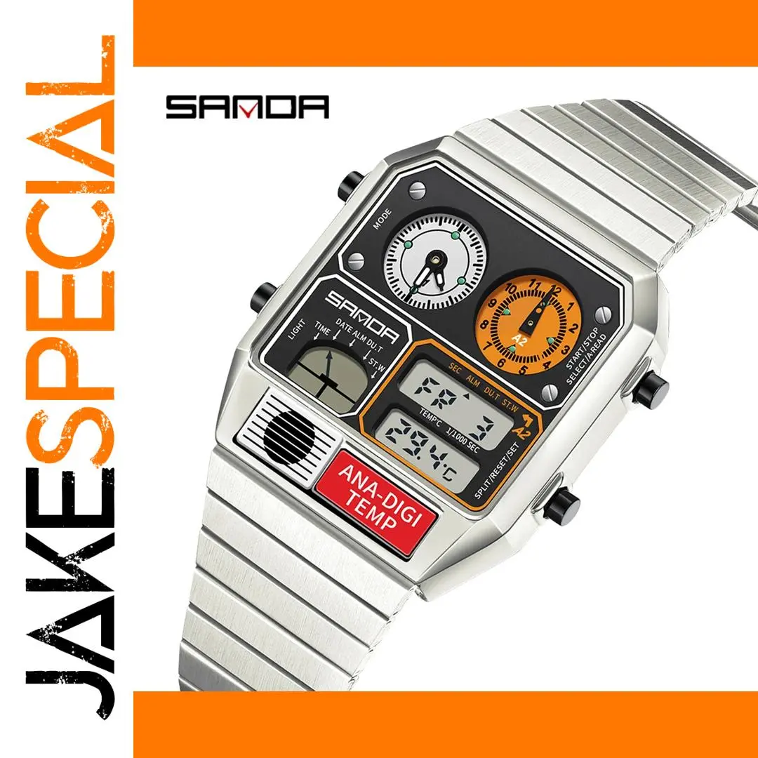 Imagine yourself sporting the stunning SANDA 3192, a perfect blend of sporty sophistication and functionality. This modern men's watch features a sleek square case made of stainless steel, measuring just 12 mm thick, making it both durable and lightweight for daily wear. The dual analog-digital display provides precision timekeeping and multifunctional capabilities, including a thermometer, stopwatch, and luminous features that enhance visibility in low light. The polished stainless steel band comfortably fits your wrist, ensuring you look as good as you feel. Whether you're engaging in a casual outing or an active adventure, this watch is designed to complement your lifestyle seamlessly.