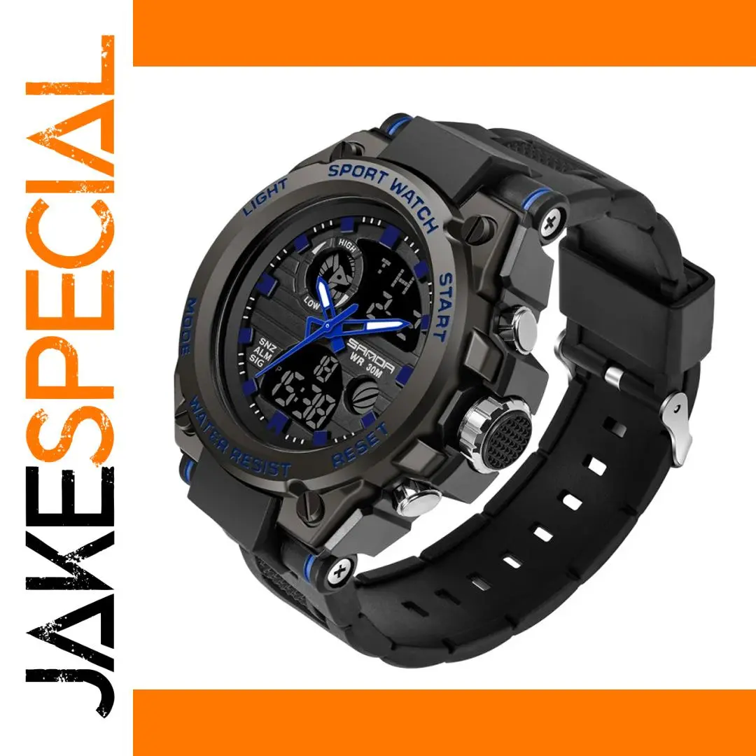 The SANDA 739 men’s watch combines durability and functionality, making it the ideal companion for adventure seekers. Its rugged rubber case ensures resilience against the elements, while the bold black dial accentuates the blue and silver analog hands, striking a perfect balance between style and practicality. Whether you're hiking, swimming, or diving, its impressive 50M waterproof feature keeps you worry-free. With added functionalities like alarm, stopwatch, and dual display, this watch is a fusion of sophistication and sportiness, designed to keep up with your active lifestyle. This versatile timepiece will not only elevate your look but also enhance your everyday experience.