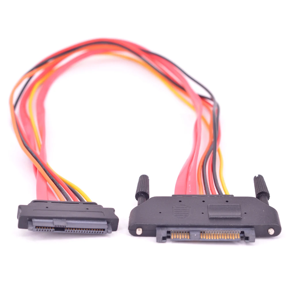 Experience reliable, high-speed data transfer with this 45cm OhLinTek SAS extension cable featuring a 29-pin male SFF-8482 connector with a secure screw lock panel and a matching female connector. Designed for server and storage systems, it supports SCSI, SAS, and InfiniBand interfaces, making it ideal for externalizing internal SAS hard disks. The robust construction includes vibrant red, yellow, and black inner wires, neatly bundled for organized deployment. Its durable design ensures a secure connection, offering peace of mind during critical data transfers and storage management. Whether expanding your storage setup or replacing existing cables, this high-quality extension cable seamlessly integrates into your enterprise environment.