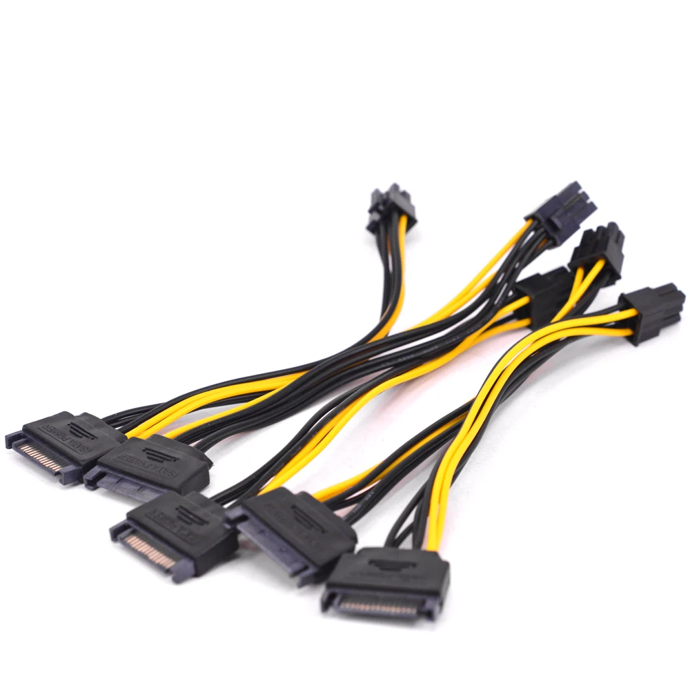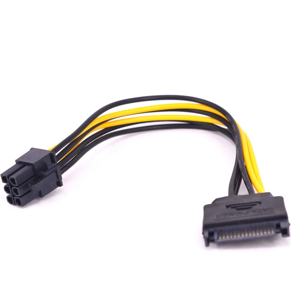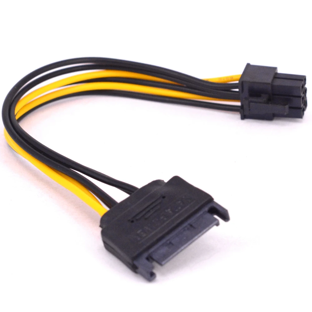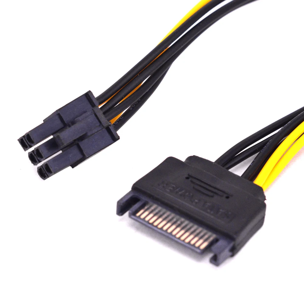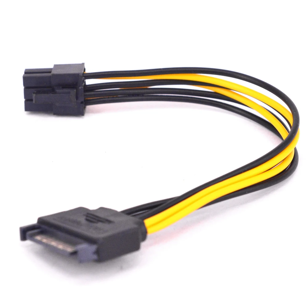This 20cm adapter cable features a black 15-pin SATA power female connector on one end and a 6-pin PCIe power male connector on the other, enabling seamless power transfer from a SATA power supply to a PCIe power input for high-performance video GPUs. Designed with a flat, ribbon-like structure, it offers durability and flexibility in mining or gaming PC setups. The cable’s minimalist, utilitarian style includes black connectors with gold-plated pins, emphasizing reliable, industrial-quality connections. Perfect for connecting SATA power sources to GPUs requiring 6-pin PCIe connectors, this adapter ensures stable power delivery and efficient system performance.