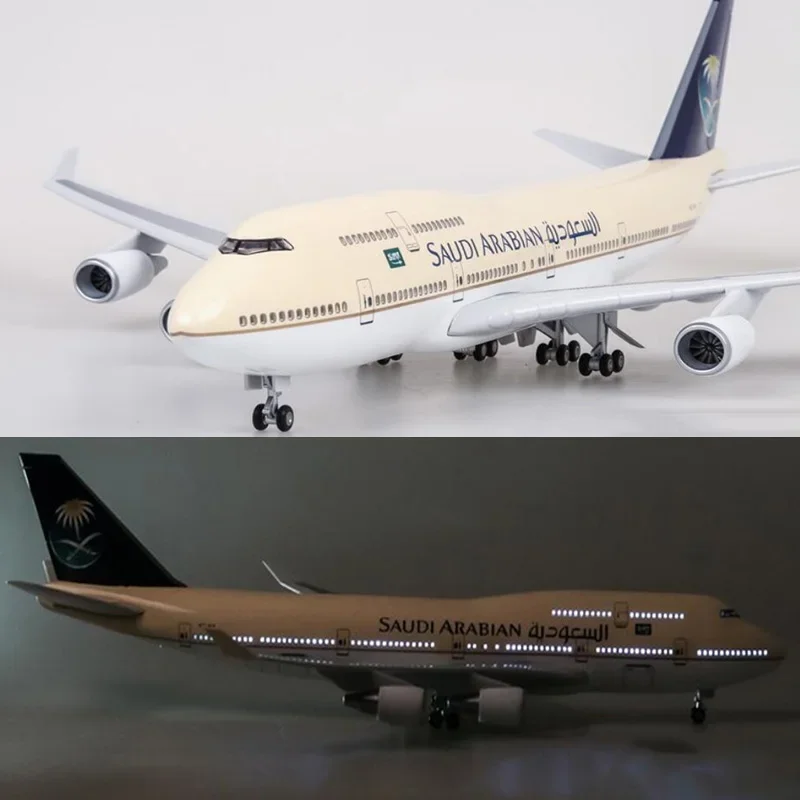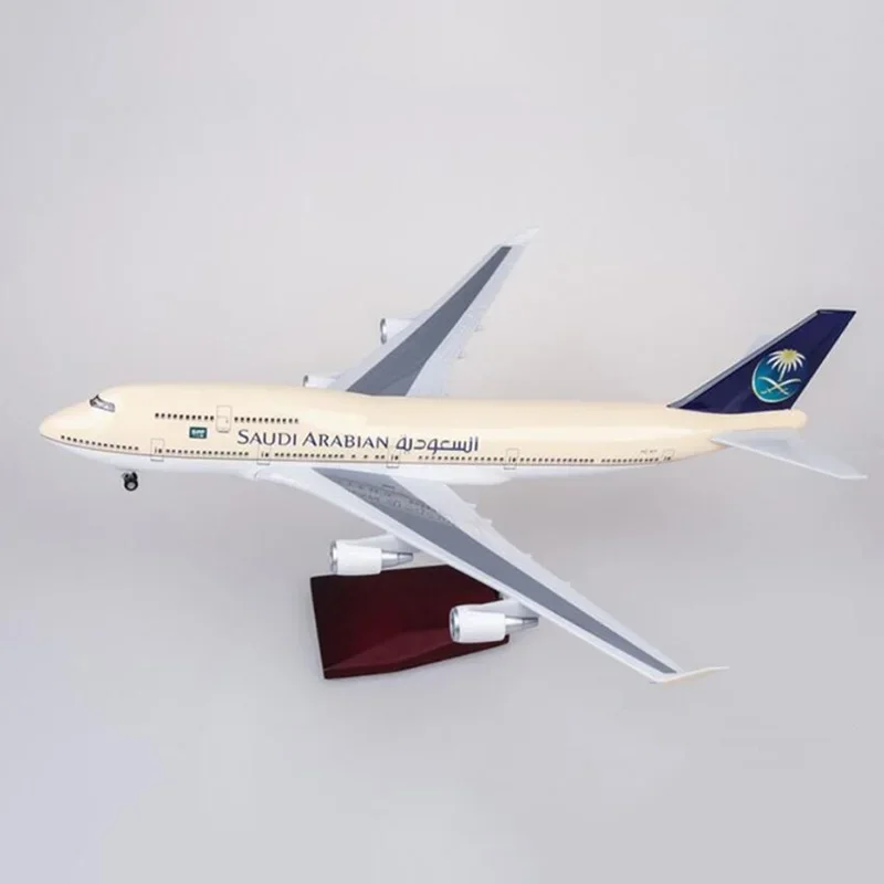 Imagine showcasing this exquisite 1:150 scale diecast resin model of a SAUDIA Airlines Boeing 747-400 in your collection. The detailed craftsmanship captures the aircraft’s sleek fuselage, featuring a realistic light beige or cream paint scheme on the upper body, complemented by the recognizable Saudi Arabian tail fin with a dark background and gold emblem. The aircraft's graceful, tapered design includes aerodynamic wings with slight upward curves at the tips and a rounded nose with intricately detailed windows and doors. The built-in, voice-activated LED lighting adds a dynamic touch, illuminating the model for about 20 seconds when triggered. Its sturdy stand and removable wings and wheels make assembling and display simple and elegant, perfect for aviation enthusiasts who value authenticity and fine detail.