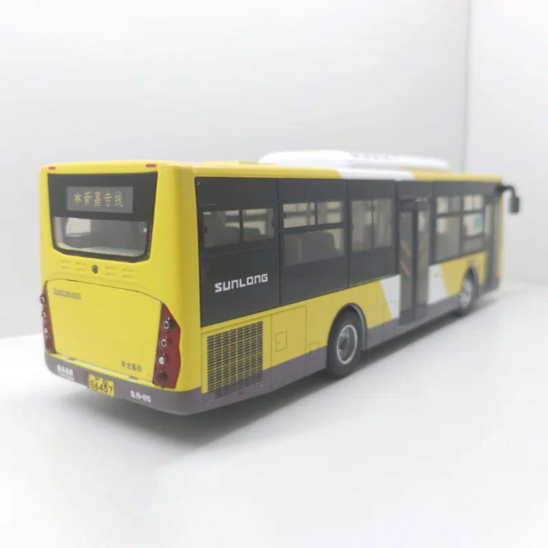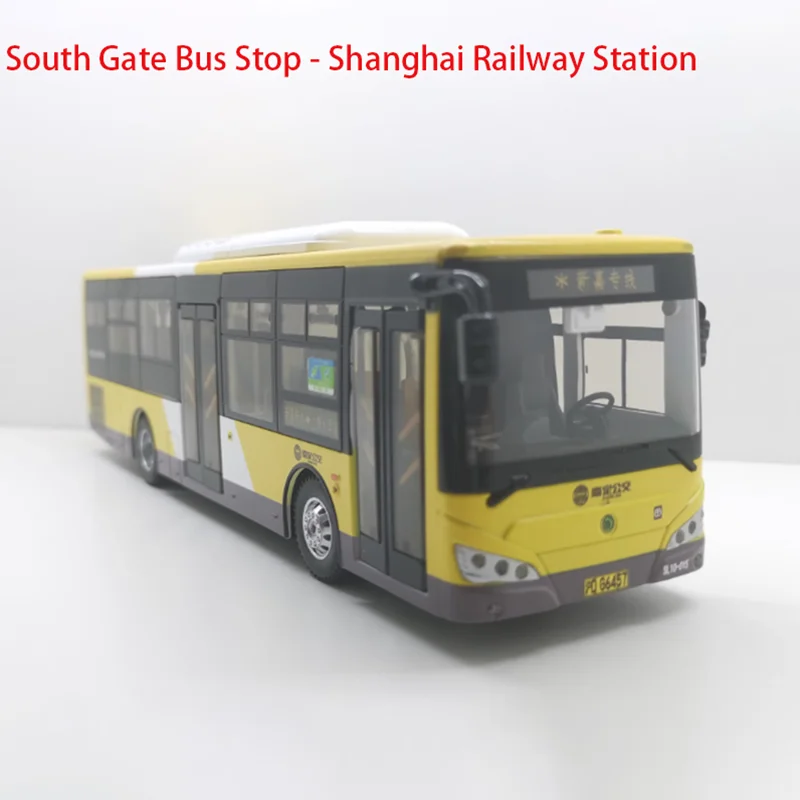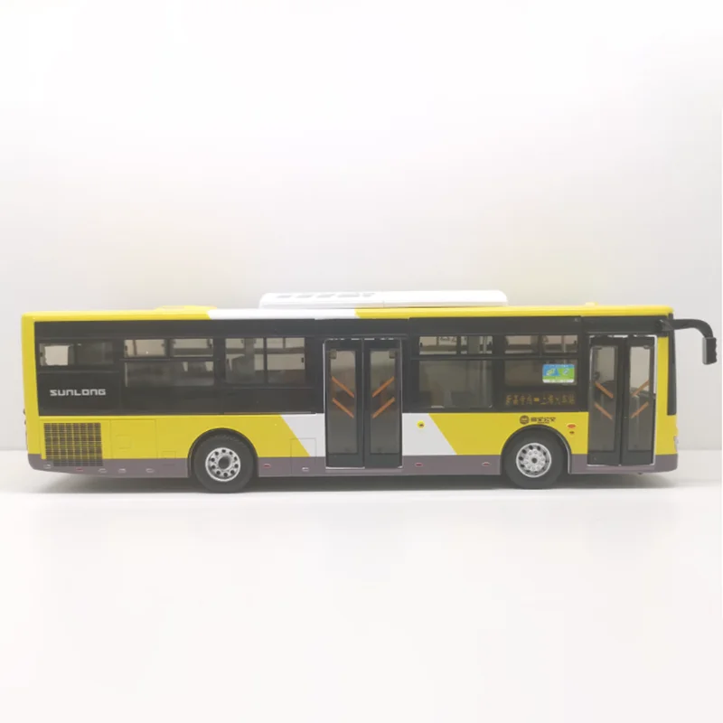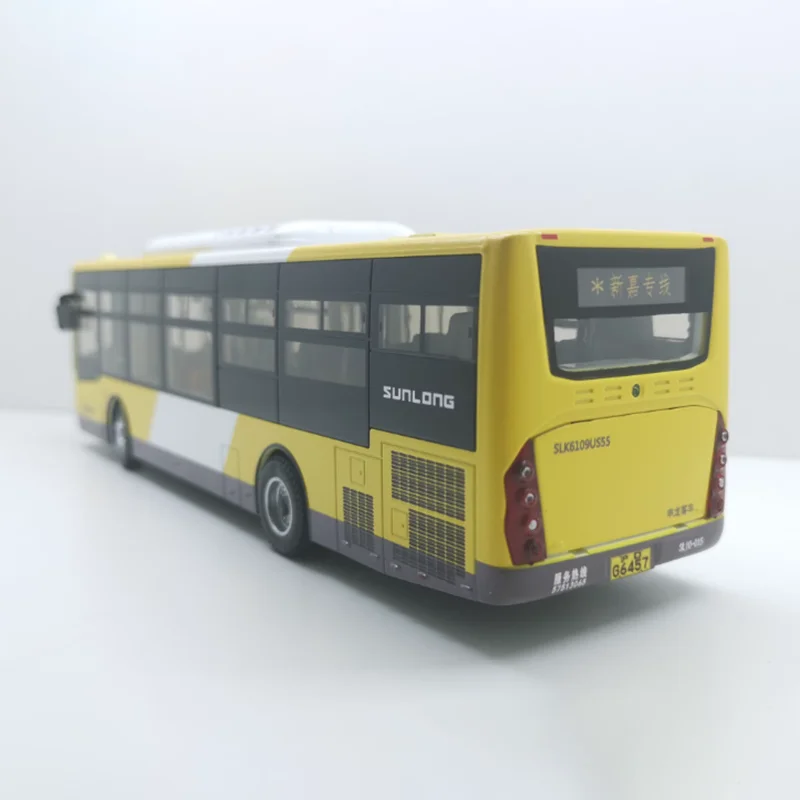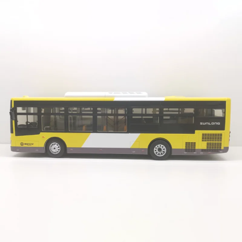 Experience the charm of this highly detailed diecast model of the Shanghai Jiading Shenlong alloy bus, scaled at 1:43. Measuring approximately 24.8 cm long, 7 cm wide, and 7.5 cm tall, this collectible piece is crafted with precision from alloy and plastic materials. The bright yellow body is complemented by black accents around the windows and doors, creating a striking and realistic appearance. The transparent, slightly curved windshield reveals an interior with detailed dashboard and seating, while black side mirrors extend outward for added authenticity. Features include clear and grey headlights mimicking real lighting, detailed silver hubcap wheels with realistic treads, and fine window pane lines. This model is perfect for collectors, displays, or as a thoughtful gift for enthusiasts.