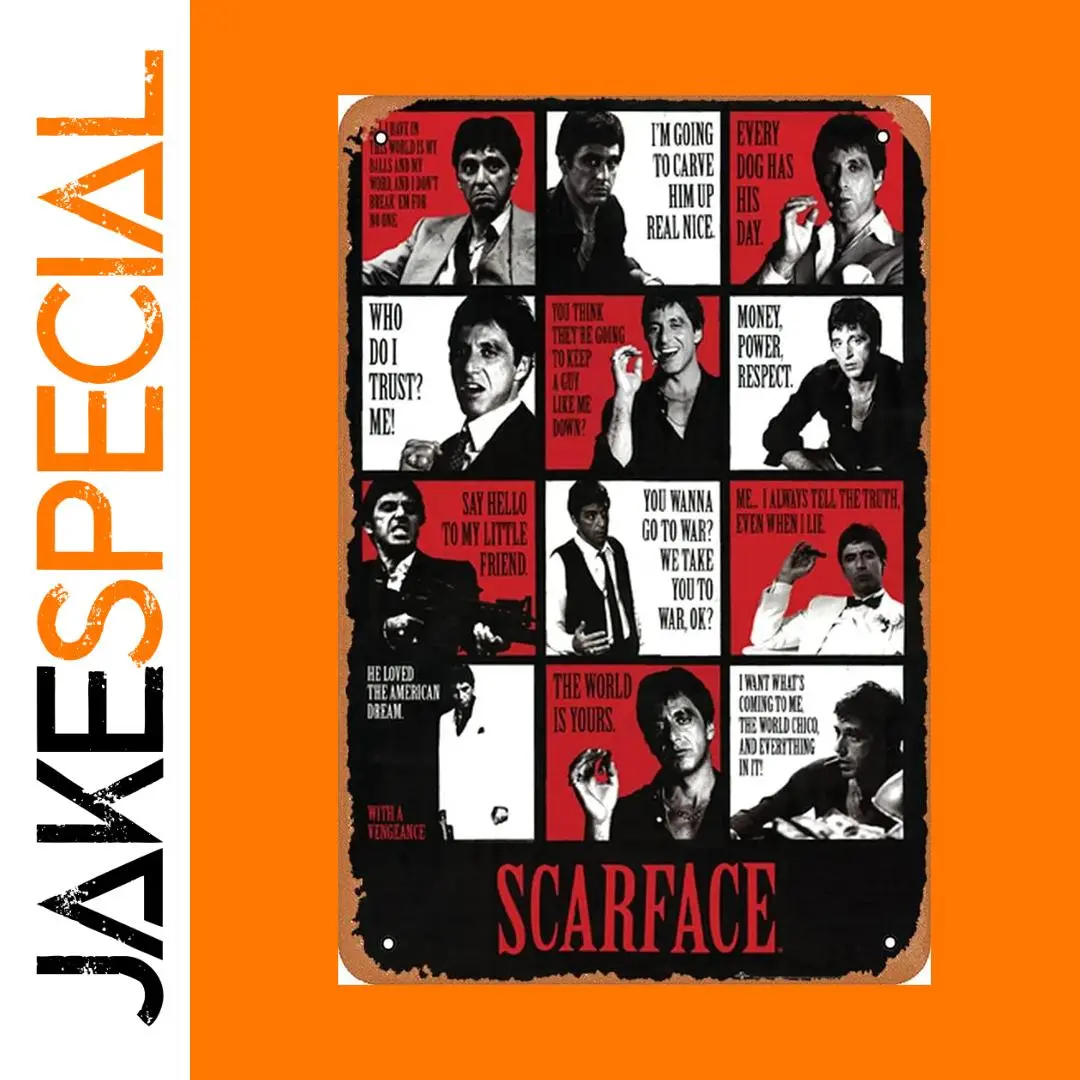 Imagine bringing home a piece of film history that captures the raw spirit of “Scarface.” This authentic-looking tin sign becomes a focal point in your space, sparking conversations and admiration. Its durable construction and stunning design make it an instant upgrade to any wall, whether in a game room, bar, or personal collection. Don't wait to add this bold, vintage piece to your decor—it's not just a sign, but a statement of attitude and style. Enhance your environment with this iconic “Scarface” memorabilia—you've earned it!