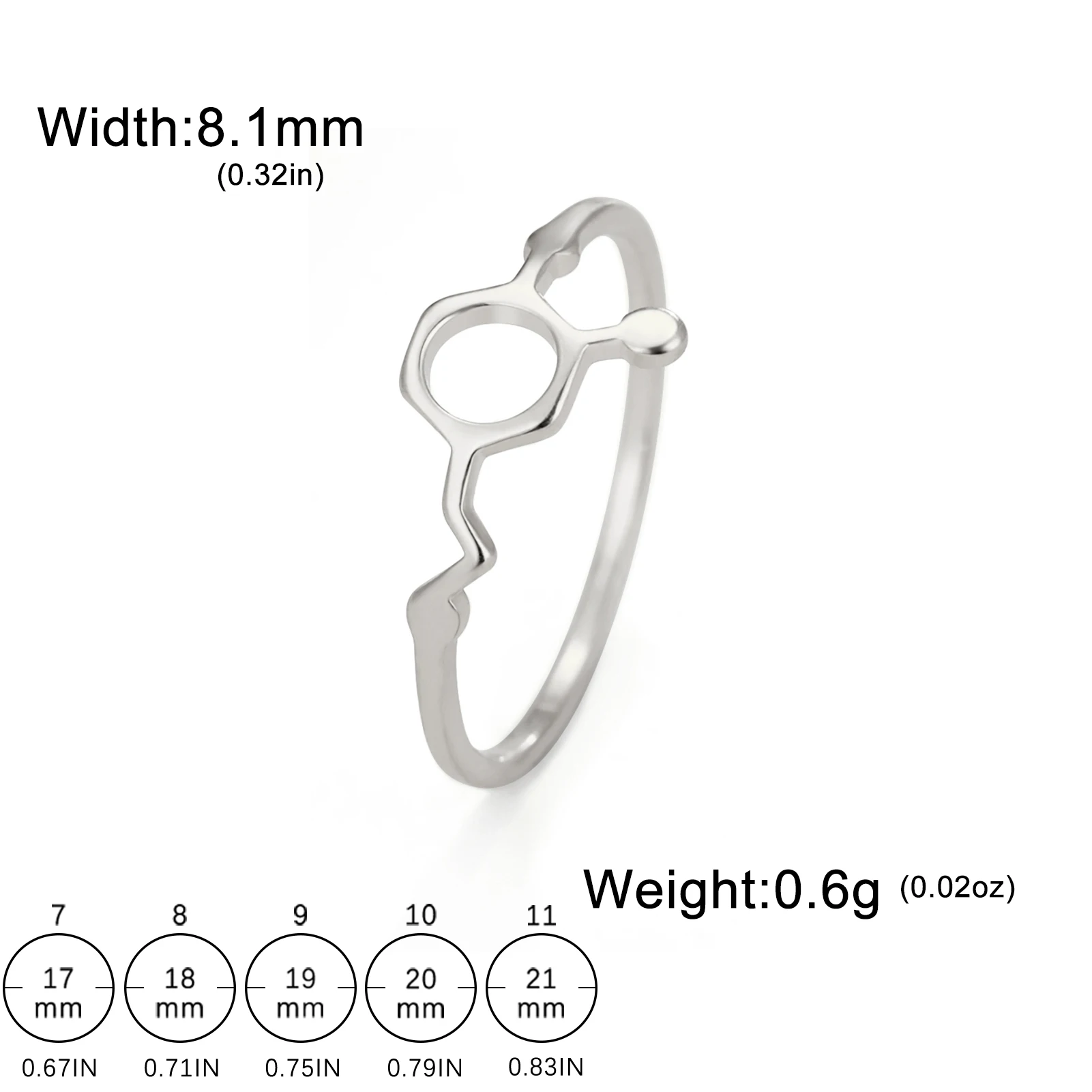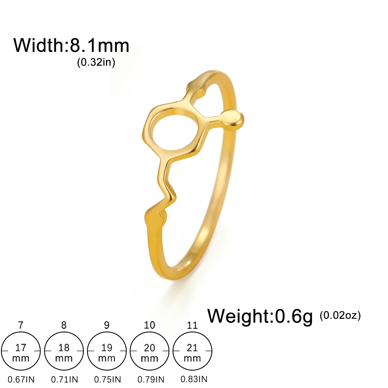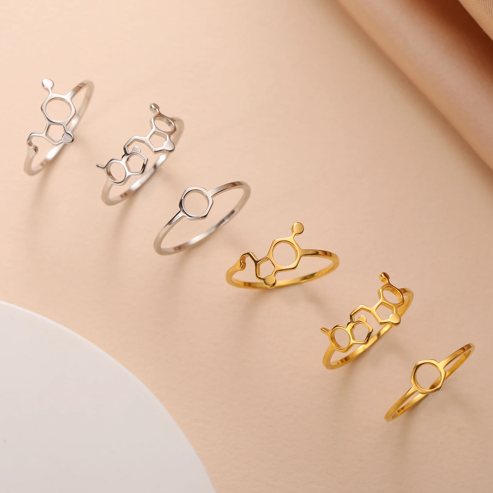 Discover the beauty of scientific artistry with this stunning stainless steel women's ring. Crafted to symbolize love, happiness, passion, and life's energy, it features sleek geometric shapes and delicate chemical molecule motifs of caffeine, dopamine, serotonin, and benzene. Available in your choice of steel or gold with genuine gold plating, this ring adds a touch of modern elegance to any outfit. Its lightweight, minimalist design makes it perfect for daily wear or special occasions like weddings, engagements, birthdays, and anniversaries. With an adjustable size from 50.3 mm (size 6) to 72.3 mm (size 13), it promises a perfect, comfortable fit. Wear this meaningful jewelry and let your style express your passion for science and life.