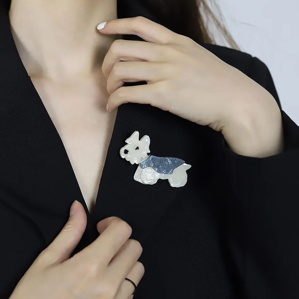 This charming Retro Texture Cute Dog Scottish Terrier Brooch is crafted from smooth, pearlescent off-white acrylic, giving it a glossy finish that catches the eye. With its playful design featuring pointed ears and a bushy beard, this stylish brooch is perfect for dog lovers and collectors alike. The blue scaled pattern on the dog's body offers an elegant contrast, reminiscent of a trendy jacket or cape. Ideal for adding a unique touch to jackets, backpacks, or hats, it effortlessly enhances any outfit. This versatile accessory is suitable for all genders, making it a great gift choice for friends and family.