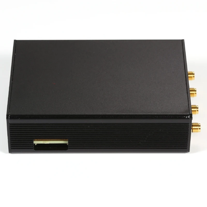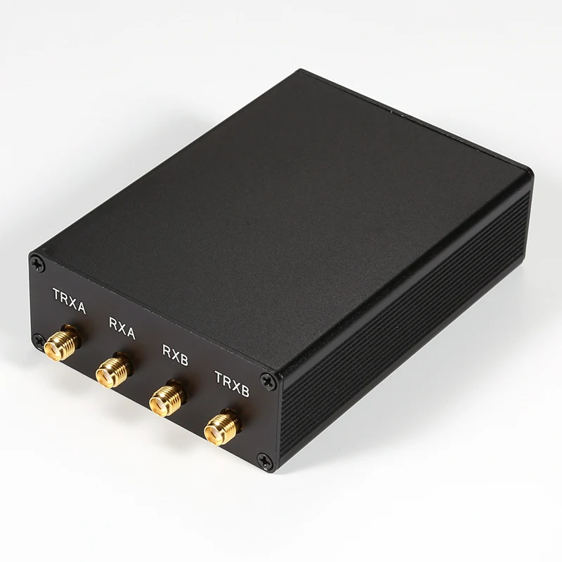 Experience the power of this advanced SDR development board, featuring a sleek and professional design with a matte black finish. Its minimalist top surface, free of buttons or screens, emphasizes a clean, high-tech aesthetic. The gold-plated RF connectors, precisely aligned in a horizontal row, highlight its functional elegance and durability. Perfectly suited for scientific research and learning, this device offers seamless integration into your projects. Visualize yourself using this tool to validate algorithms, explore spectrum detection, or conduct mobile communication experiments. Its compact form and robust build encourage confidence and inspire innovation, making it an essential addition to any RF or communication lab setup. Feel the satisfaction of owning a device built for precision and technical excellence.