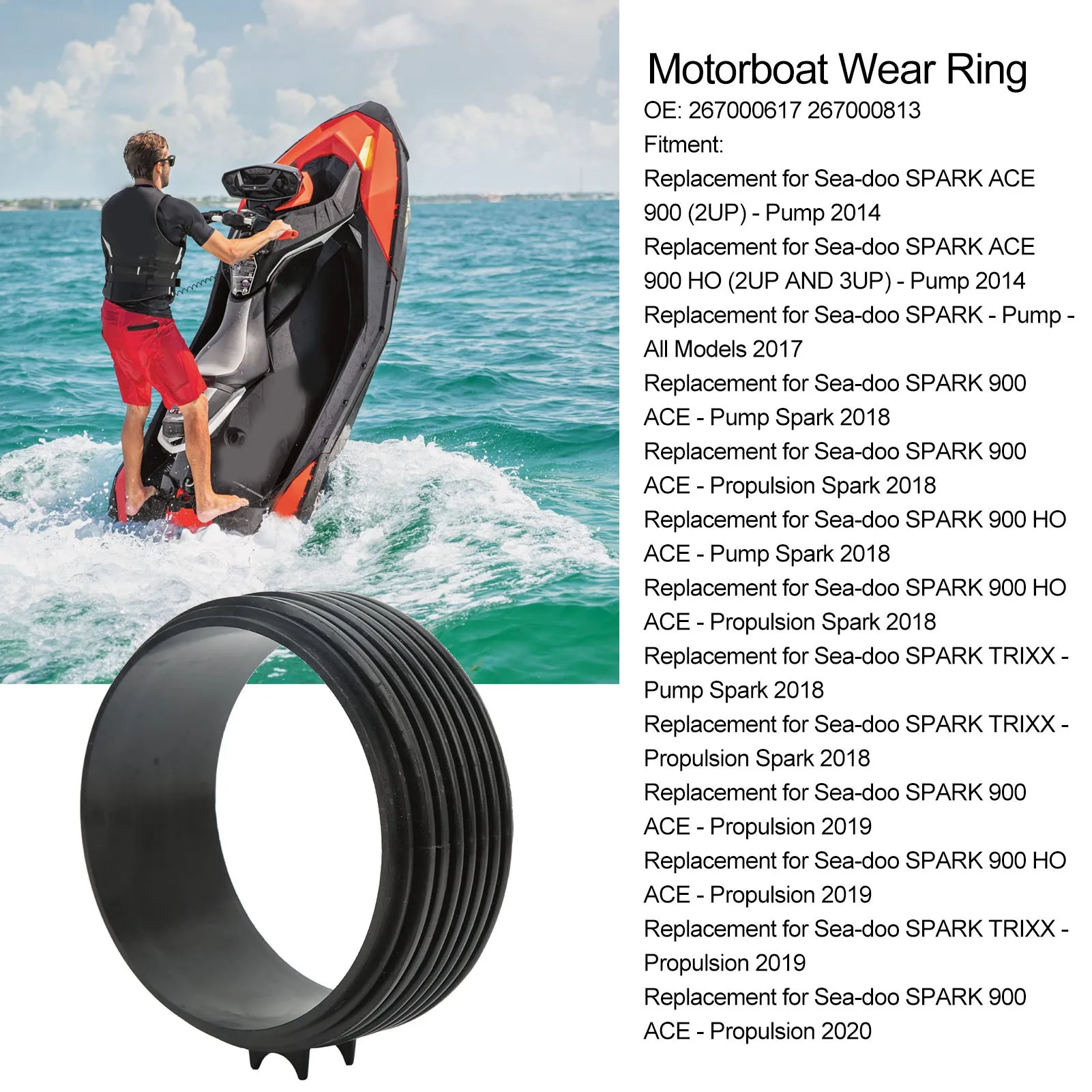 Experience a seamless restoration of your Sea-Doo jet ski’s performance with this high-performance wear ring. Crafted from durable ABS material, this sleek black component is designed to fit models from 2014 to 2021, including SPARK ACE 900, SPARK 900 HO ACE, and SPARK TRIXX. Its smooth, solid surface combined with evenly spaced vertical ribs on the outer circumference ensures optimal structural strength and easy installation. The slight raised lip enhances sealing and fitment, reducing cavitation and restoring impeller clearance for maximum efficiency. Whether you own a 2UP, 3UP, or built-up version, this OEM-standard replacement promises long service life, wearproof performance, and reliance for high-pressure marine applications. It’s your go-to part for maintaining peak jet pump operation.