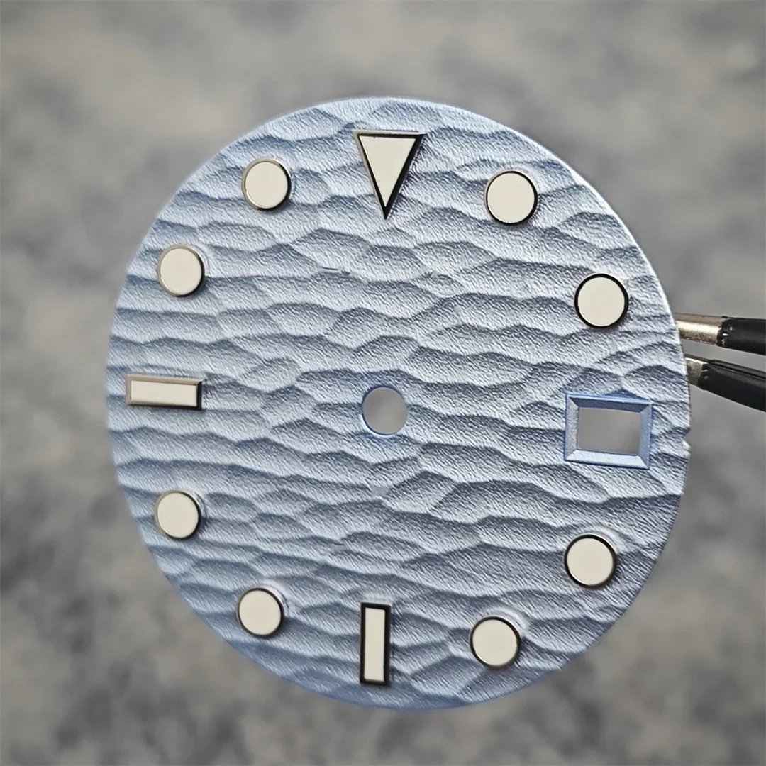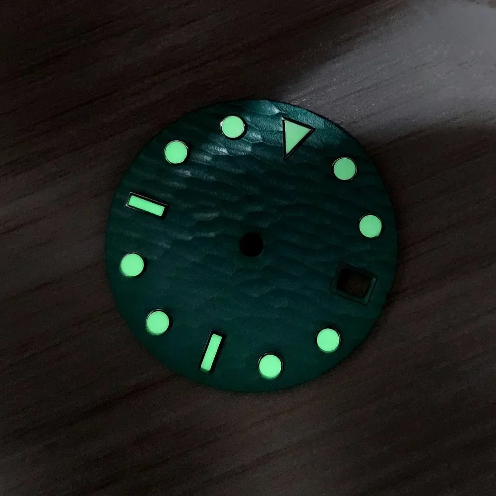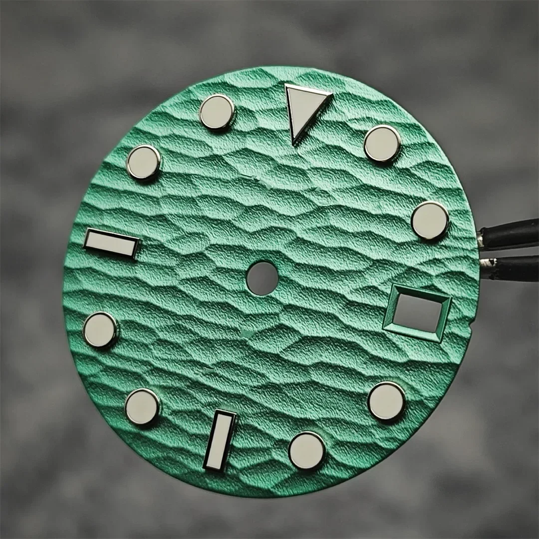 Experience the elegance and craftsmanship of this 28.5mm MDNEN watch dial, designed for NH35, NH36, 4R, and 7S movements. Featuring a stunning textured sea wave pattern surface in a vibrant green luminous finish, it showcases Arabic numeral markers, a round stainless steel construction, and a versatile design suitable for unisex wear. The dial’s durable build and luminous accents ensure both style and functionality, perfect for custom watch enthusiasts aiming to elevate their timepieces. Available in multiple color options, including black gold, black silvery nail, light blue, light green, and white, this high-quality replacement dial combines aesthetic appeal with precise technical compatibility.