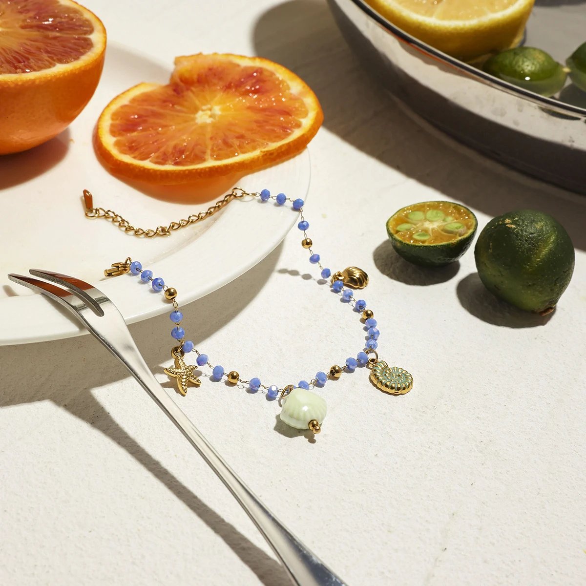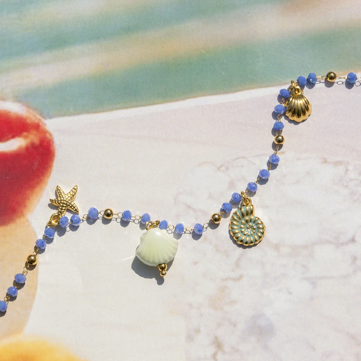 - Features a beaded chain with tiny, round light blue beads linked by delicate gold-colored loops, creating an elegant oceanic aesthetic.