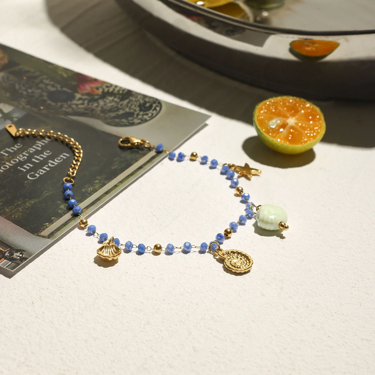 Discover the perfect accessory to channel seaside tranquility with this beautiful beach-inspired charm bracelet. Crafted from durable stainless steel, it combines waterproof strength with elegance, ideal for daily wear or special summer outings. The beaded chain features small, round light blue beads that evoke calming ocean waves, interconnected by fine gold-colored loops that add texture and sophistication. Decorated with intricately detailed charms—such as a textured starfish, ridged shell, scallop-shaped shell, and a shiny, pale greenish shell—each element captures nautical beauty. The standout polished shell adds a subtle pop of color and gloss, creating a breezy, summery vibe. Whether worn casually or for beach days, this bracelet is a versatile choice that brings oceanic charm to your wardrobe.