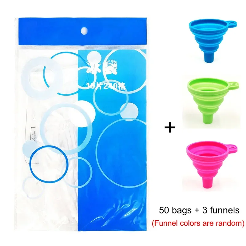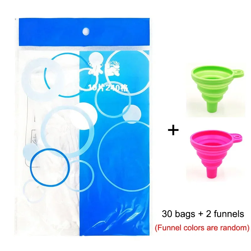 - Integrated funnels at the opening of each bag enable straightforward, drip-free filling with liquids, minimizing mess and saving time during preparation.